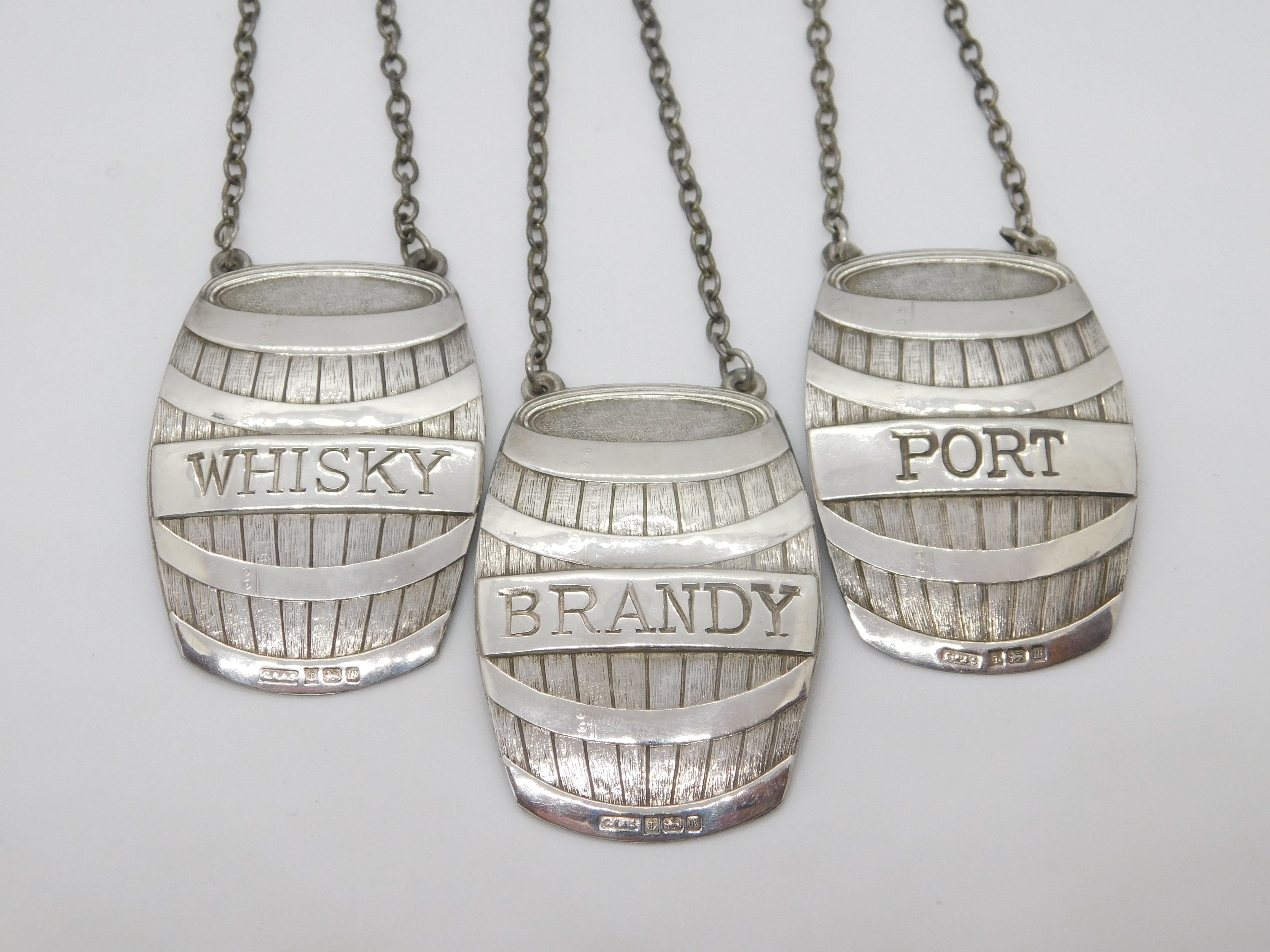 Sterling Silver Novelty Barrel Port, Whisky, Brandy Decanter Label Set Vintage
