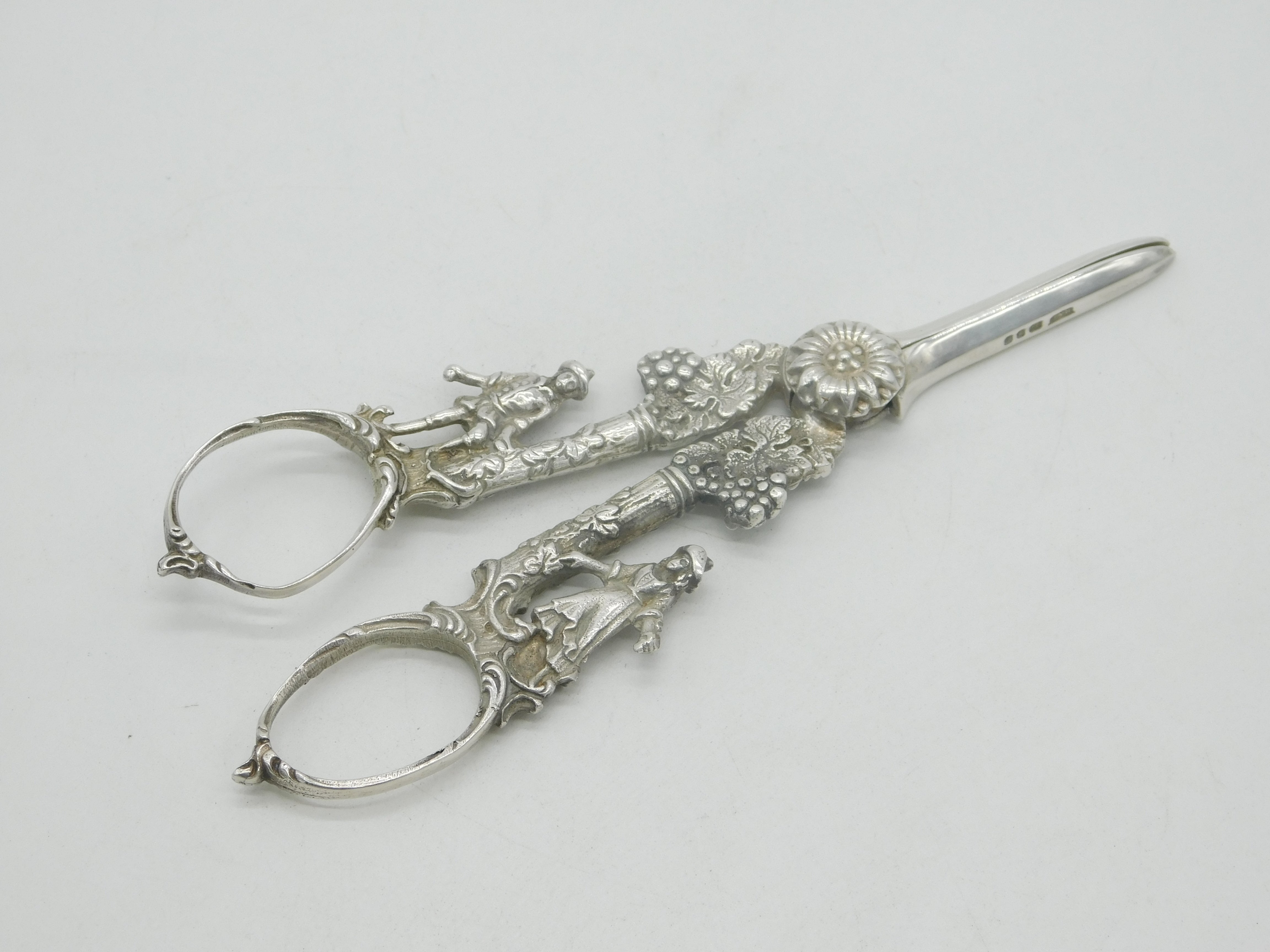 Sterling Silver Regency Couple & Floral Pattern Grape Scissors 1970 Vintage