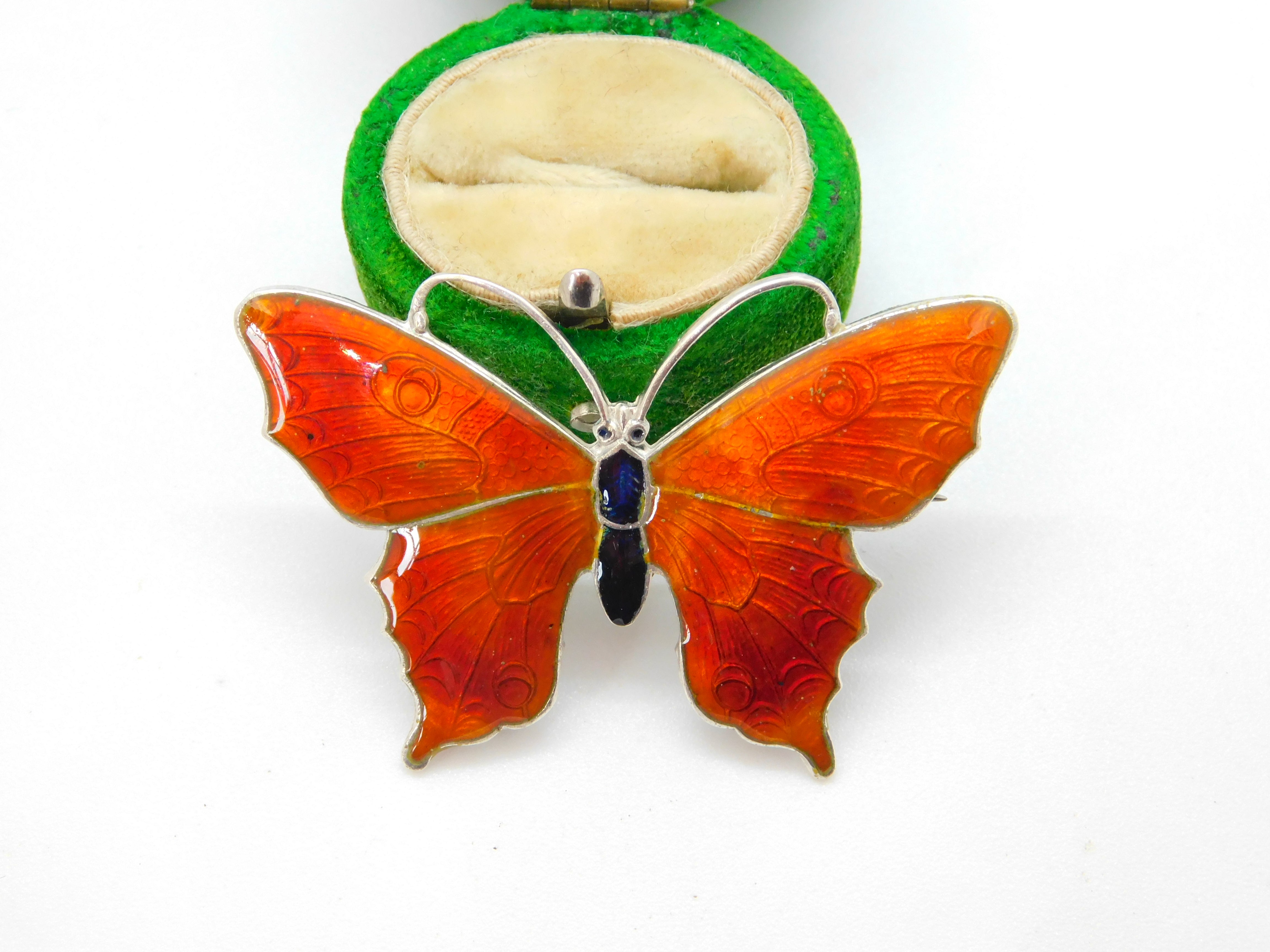 Sterling Silver Red-Black Guilloche Enamel Butterfly Sweetheart Brooch Antique