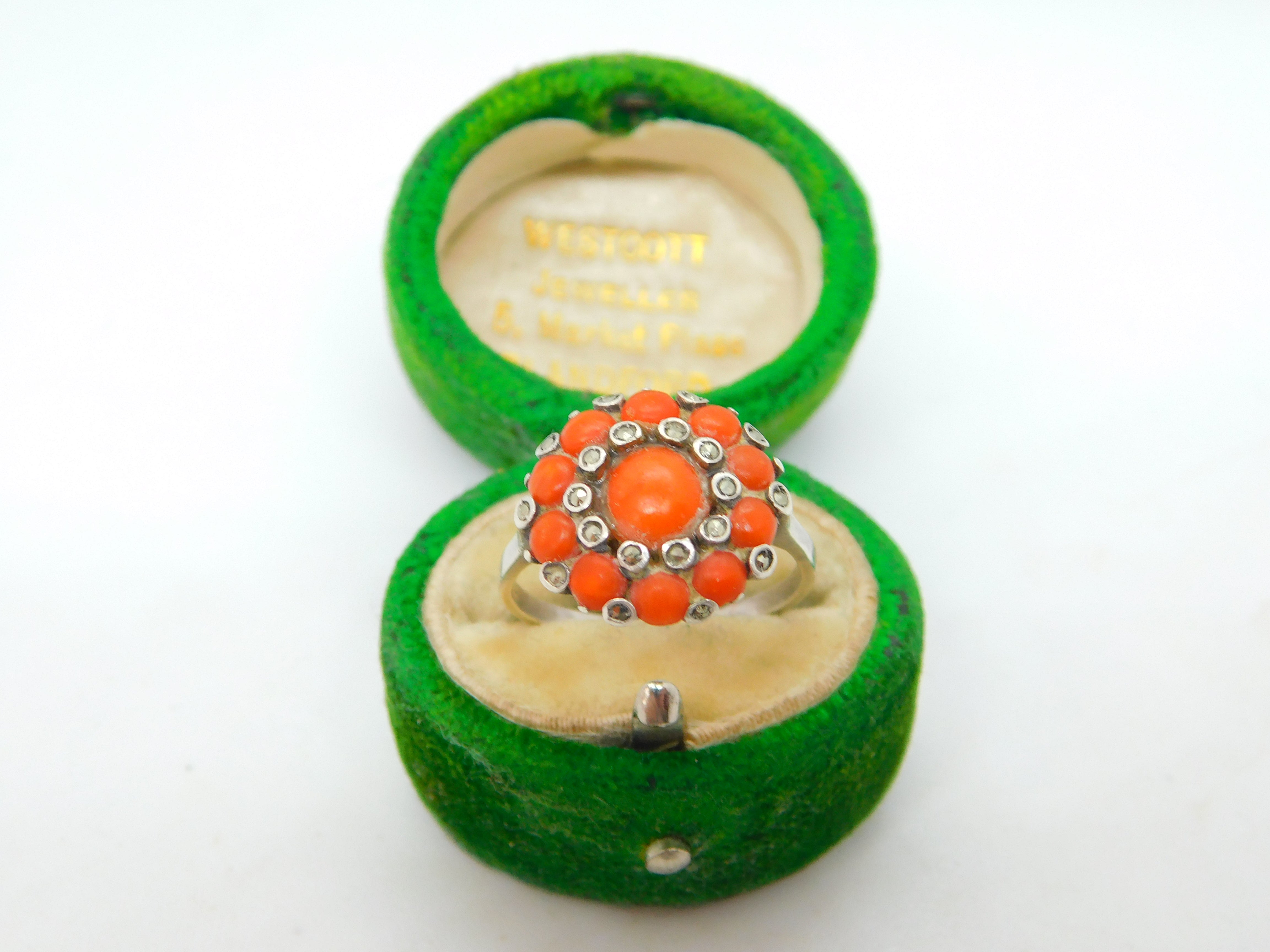 Sterling Silver Red Coral & Marcasite Floral Cluster Ring Antique c1920 Art Deco