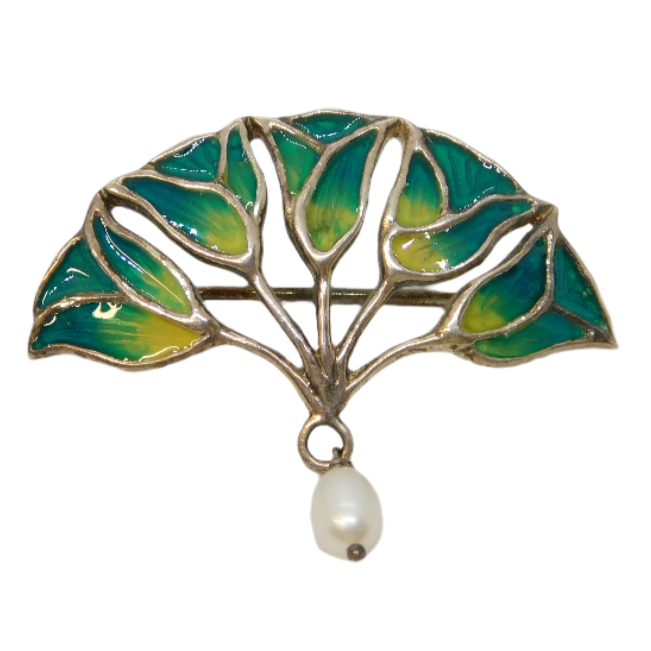 Sterling Silver, Drop Pearl & Guilloche Enamel Tulip Form Brooch Vintage c1970