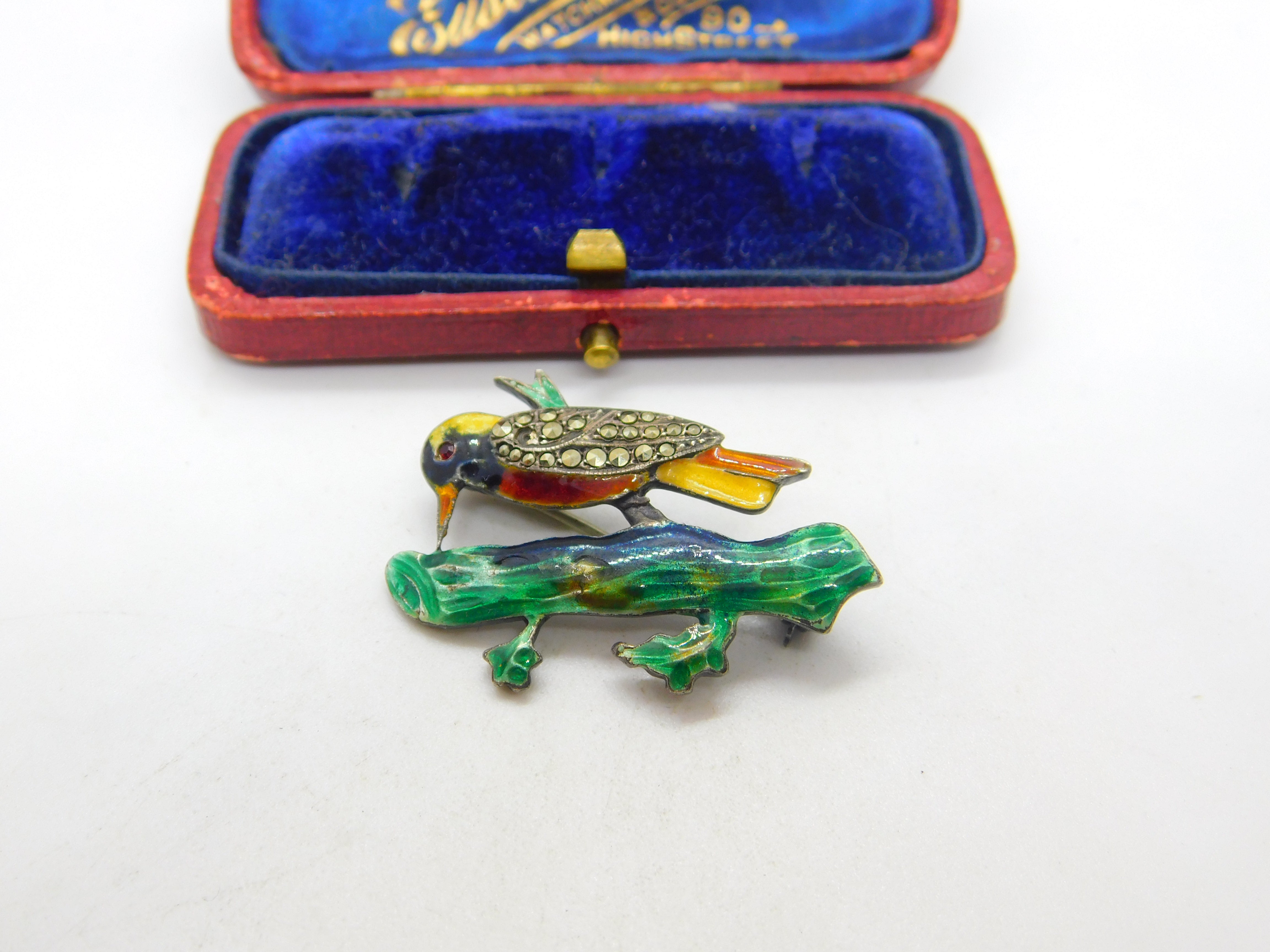 Sterling Silver, Colourful Enamel Marcasite Woodpecker Brooch Antique c1940