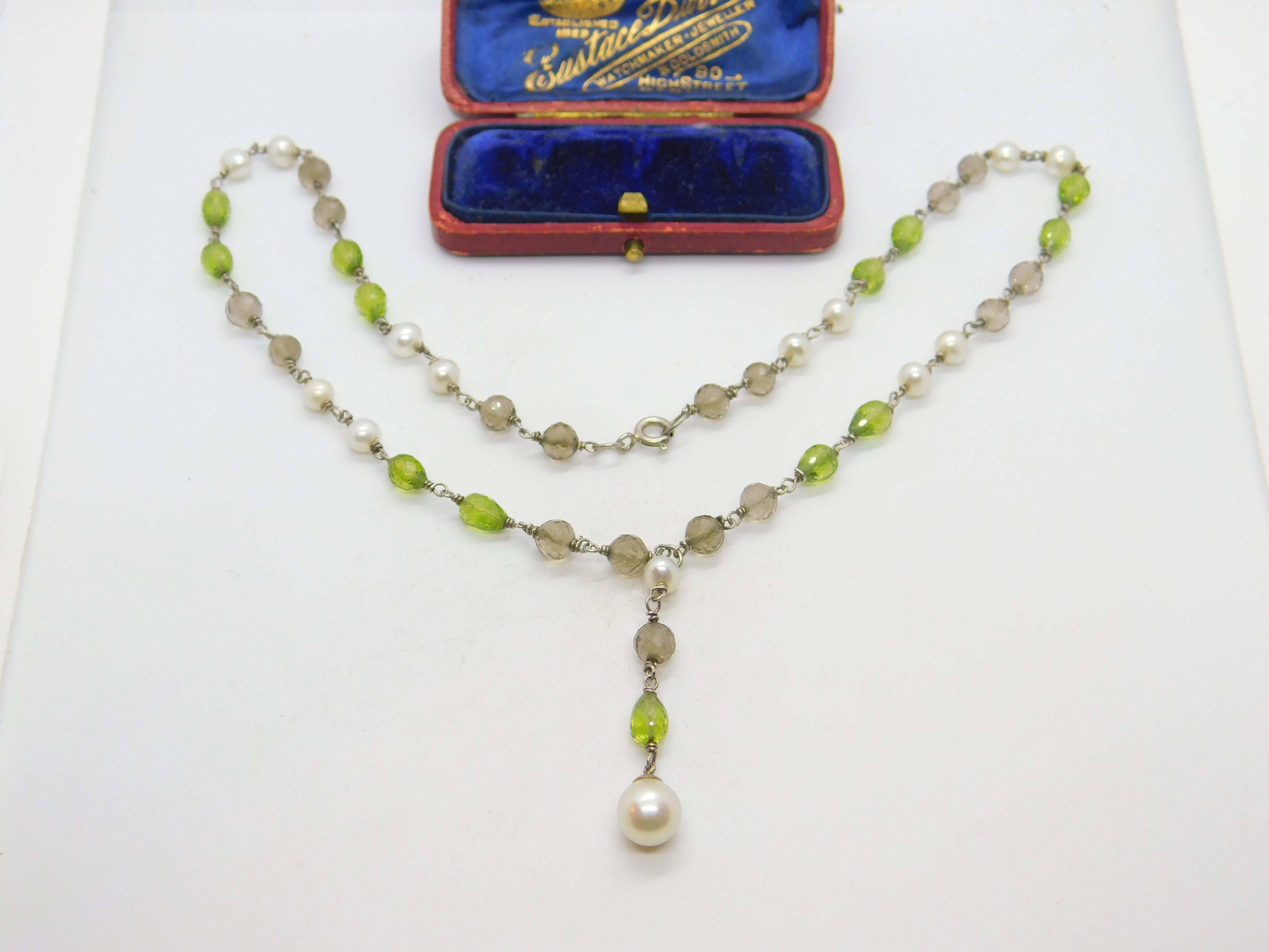 Sterling Silver, Pearl, Citrine & Peridot Drop Necklace Antique c1920 Art Deco