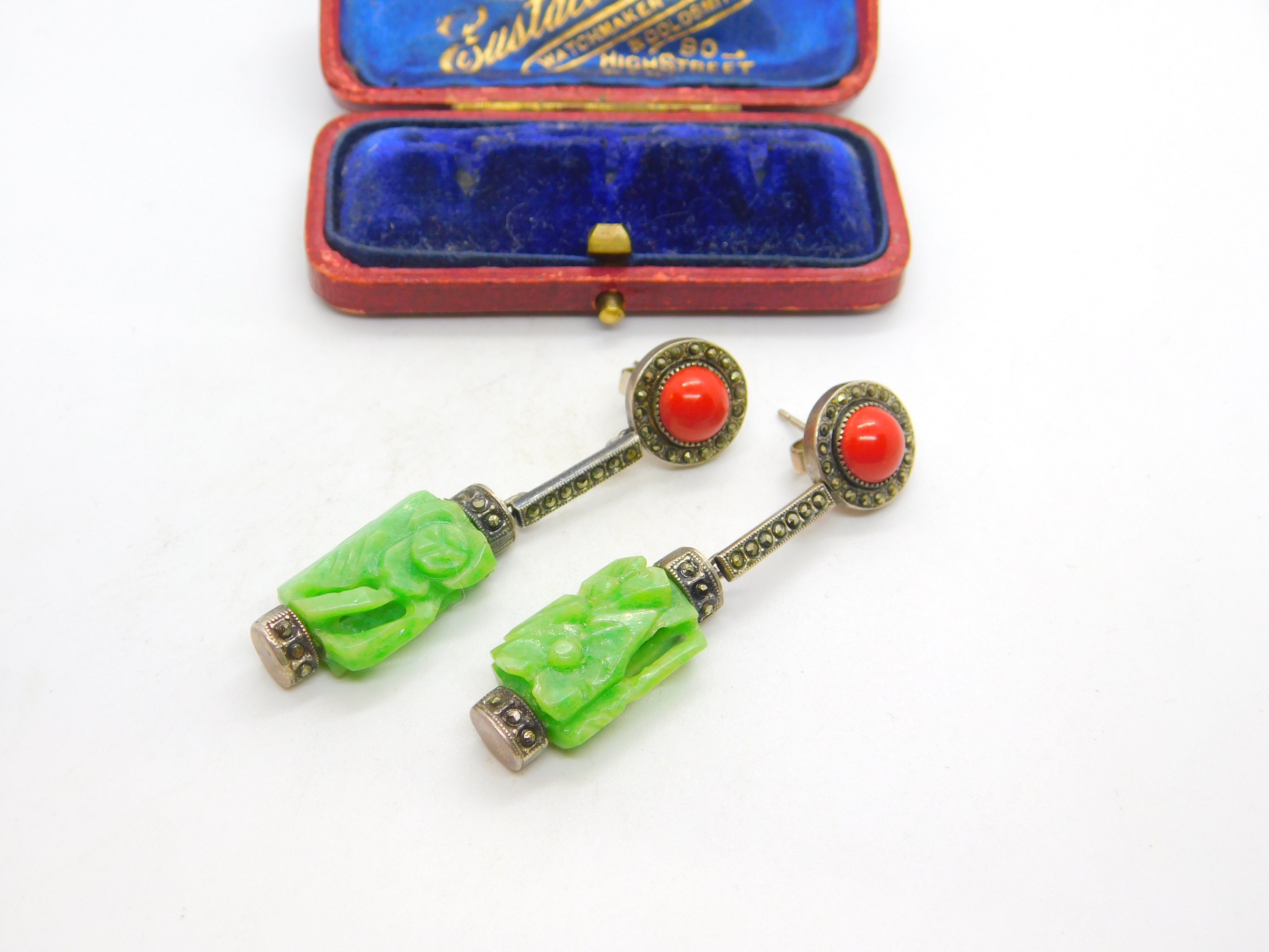Sterling Silver, Marcasite, Coral & Carved Jadeite Drop Earrings Antique