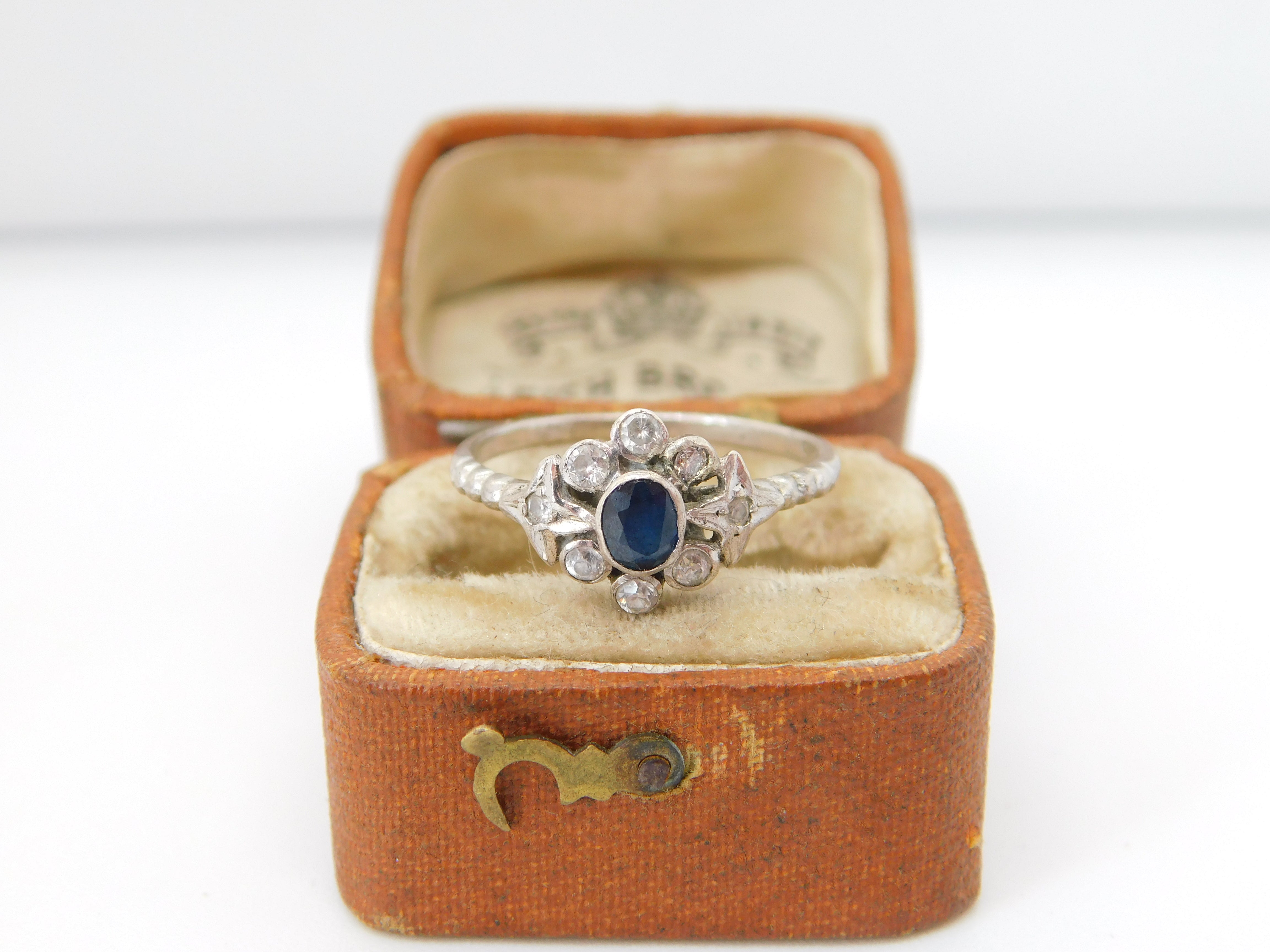 Sterling Silver, Blue Sapphire & Spinel Set Floral Cluster Ring Antique c1930