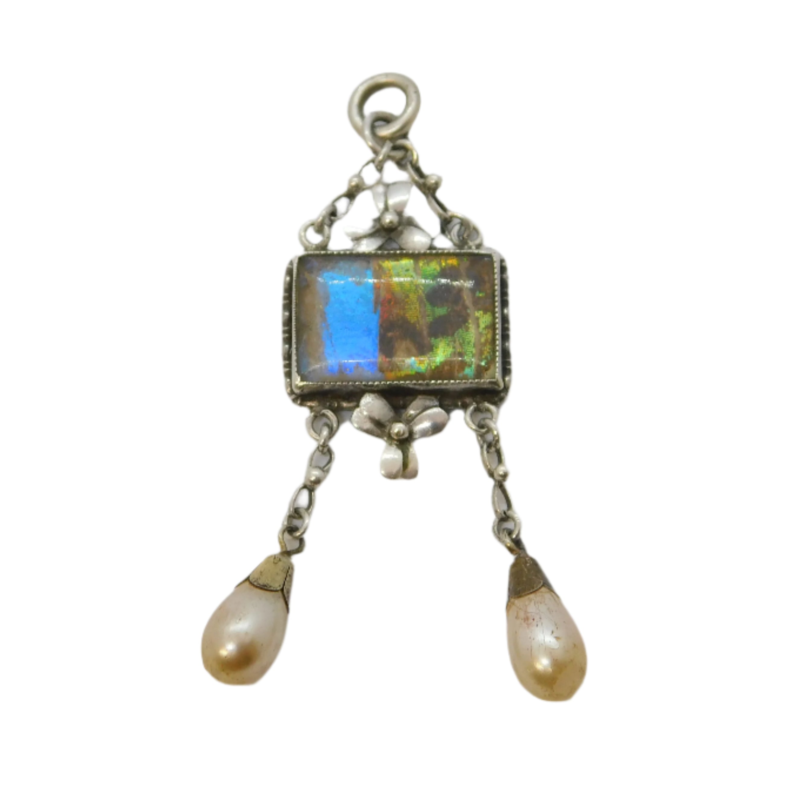 Sterling Silver, Butterfly Wing, Cultured Pearl Shamrock Drop Pendant Antique c1920