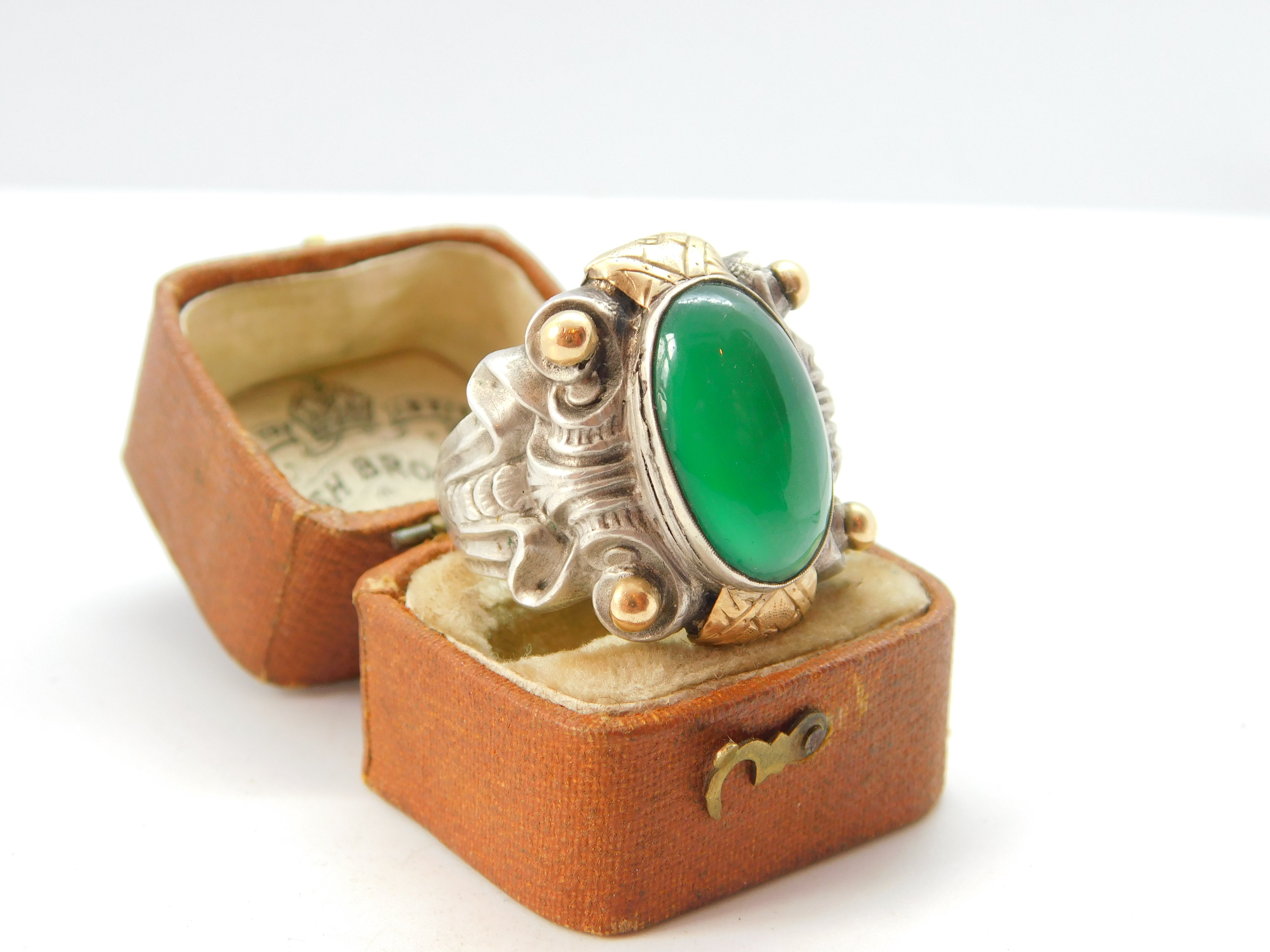 Sterling Silver, 9ct Gold & Green Chalcedony Cabochon Aztec Style Ring Antique