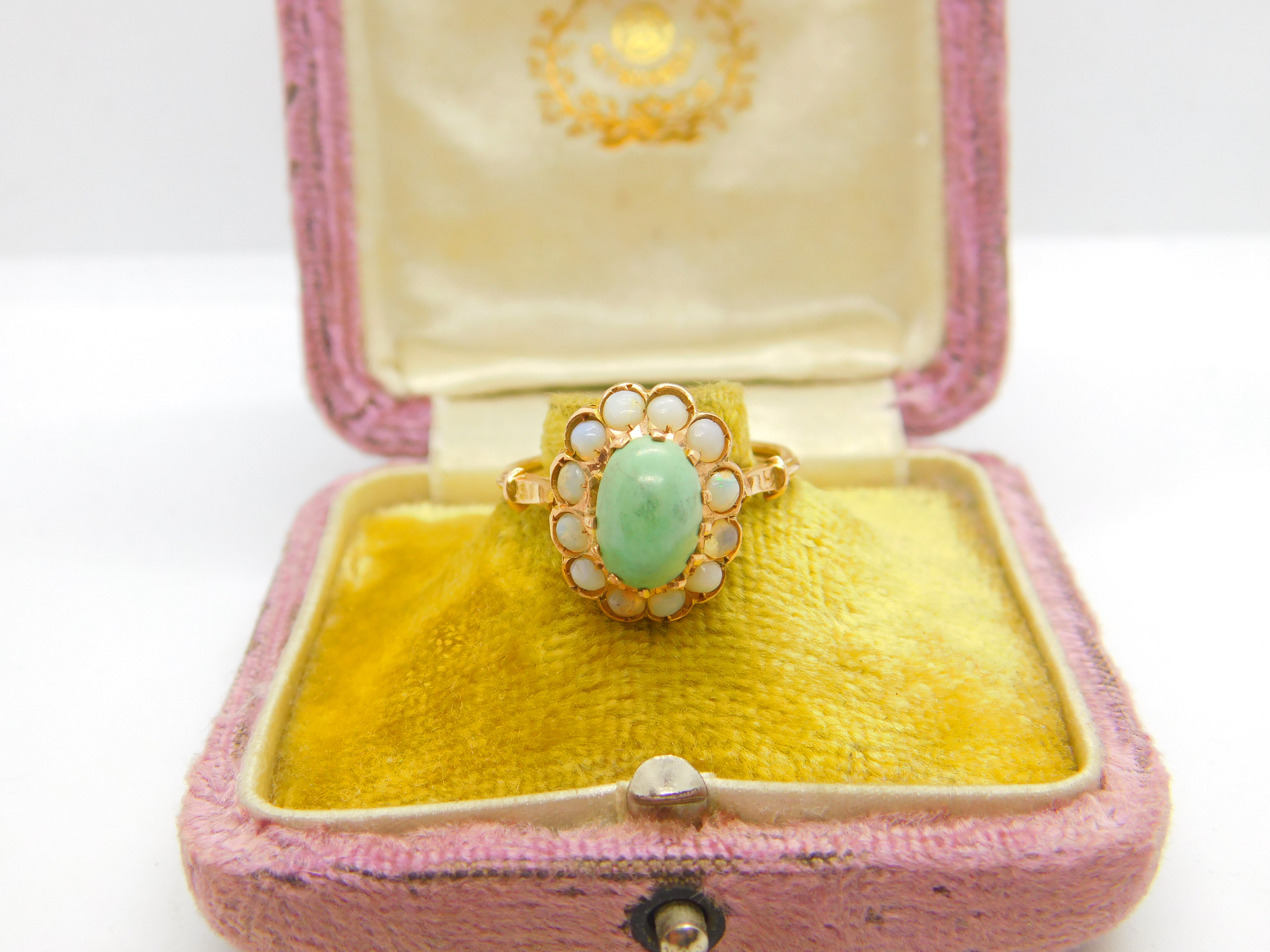 Victorian 14ct Gold, Cabochon Turquoise & Opal Floral Cluster Ring Antique c1880