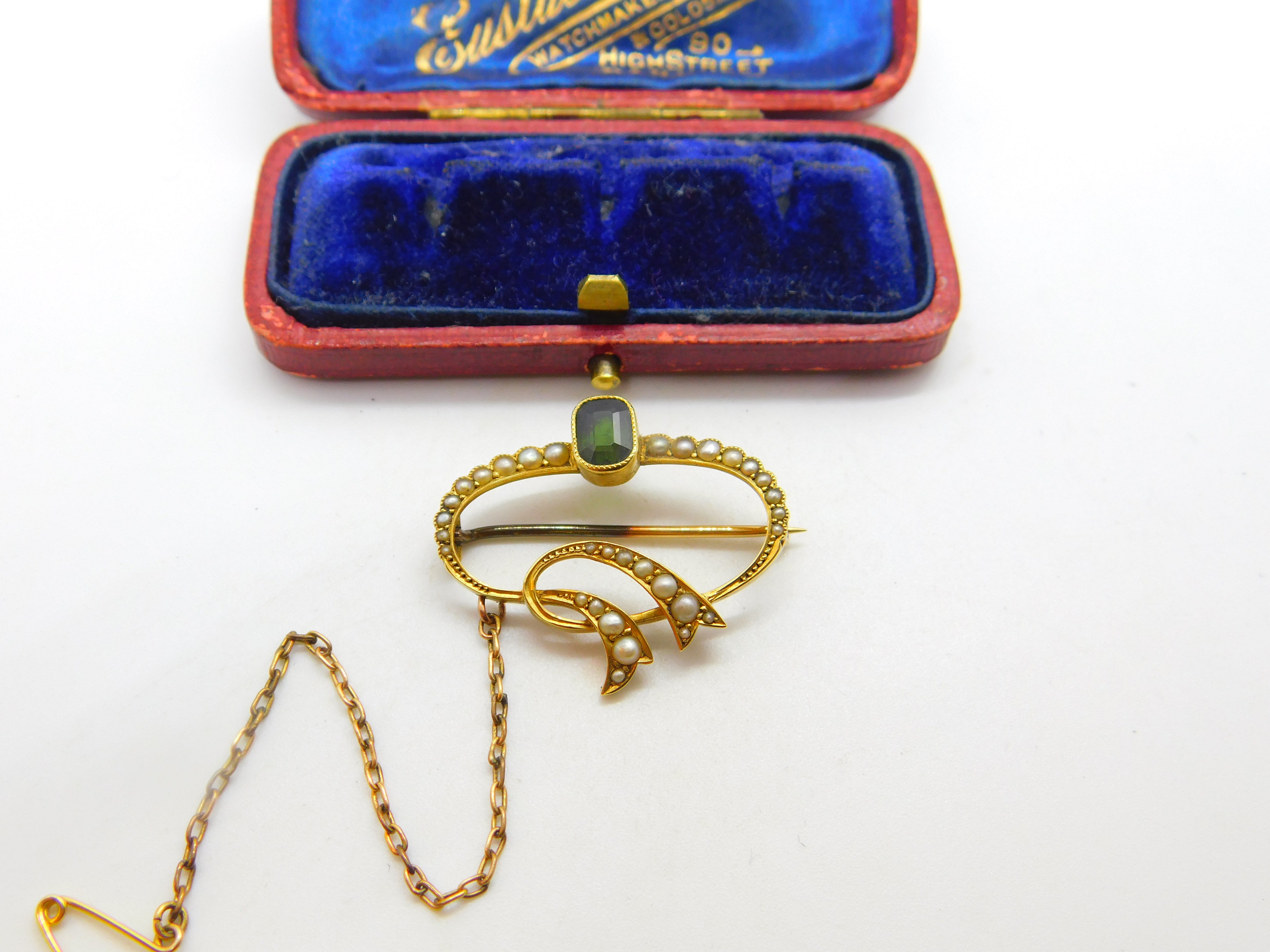 Victorian 15ct Gold, Tourmaline & Seed Pearl Swirl Sweetheart Brooch c1860