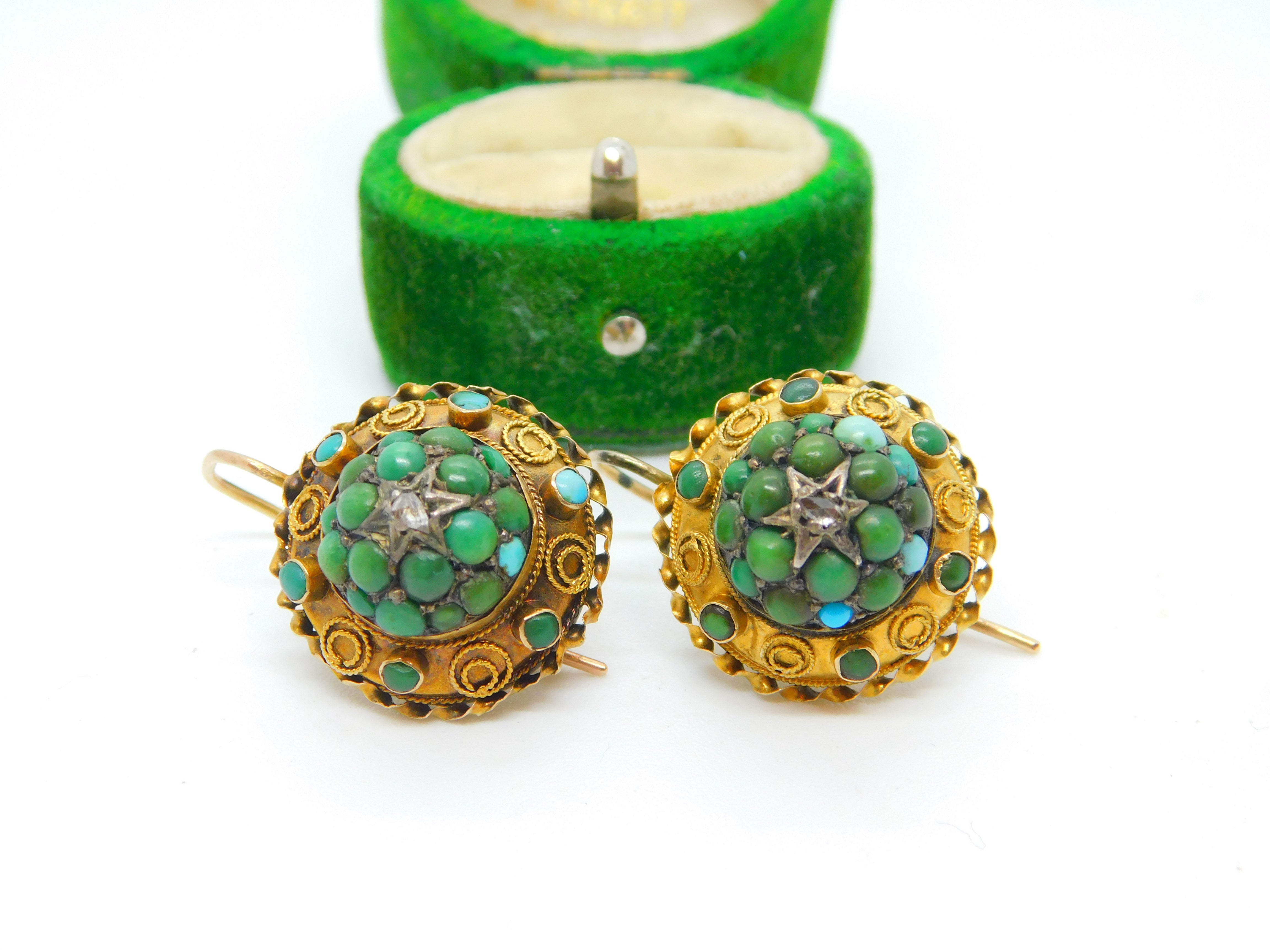 Victorian 15ct Gold, Turquoise & Rose Cut Diamond Hook Earrings Antique c1860