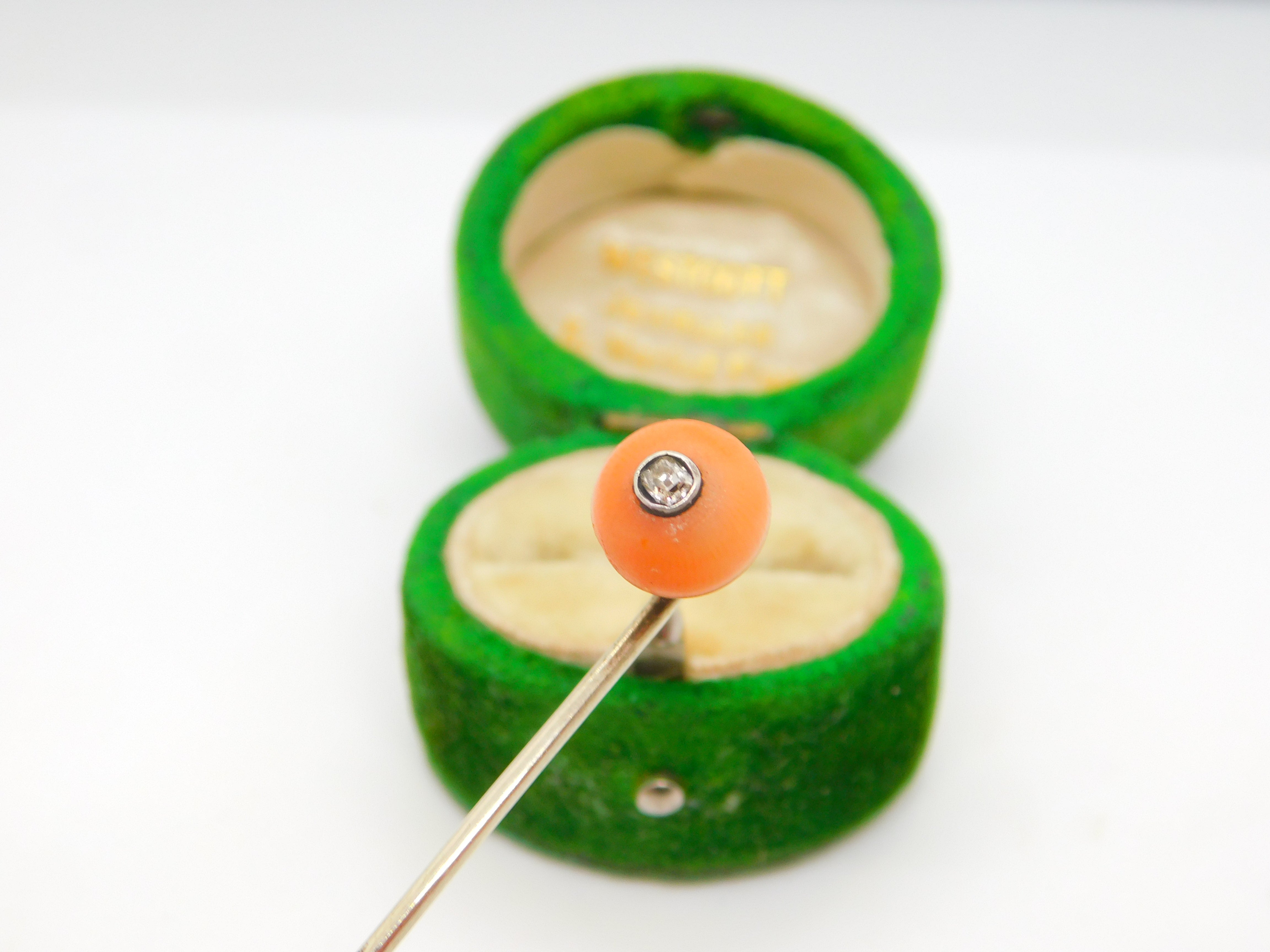 Victorian 15ct Gold, Red Coral & Old Cut Diamond Stick Pin Antique c1840