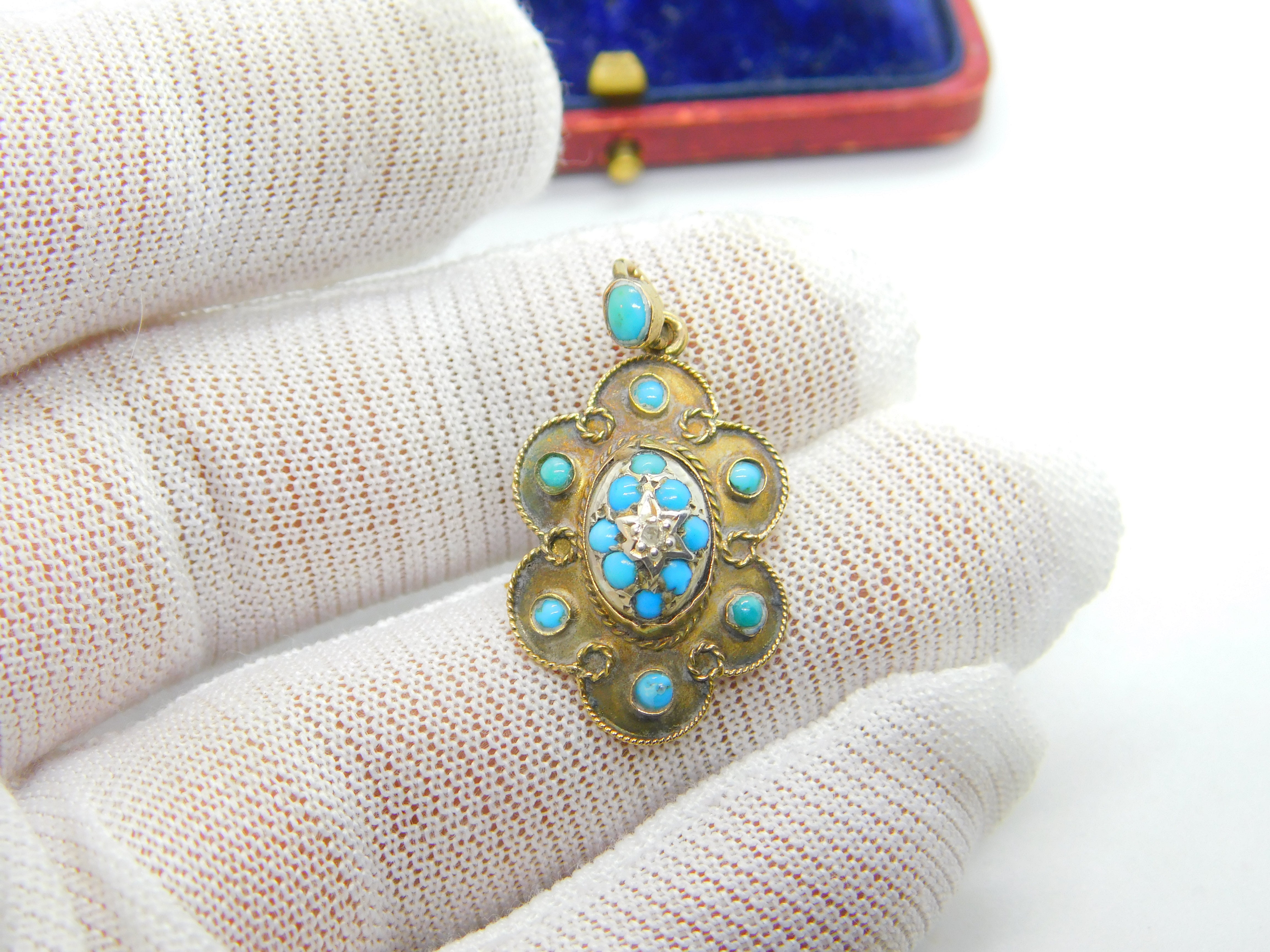 Victorian 15ct Gold, Turquoise & Diamond Floral Drop Pendant c1860 Antique