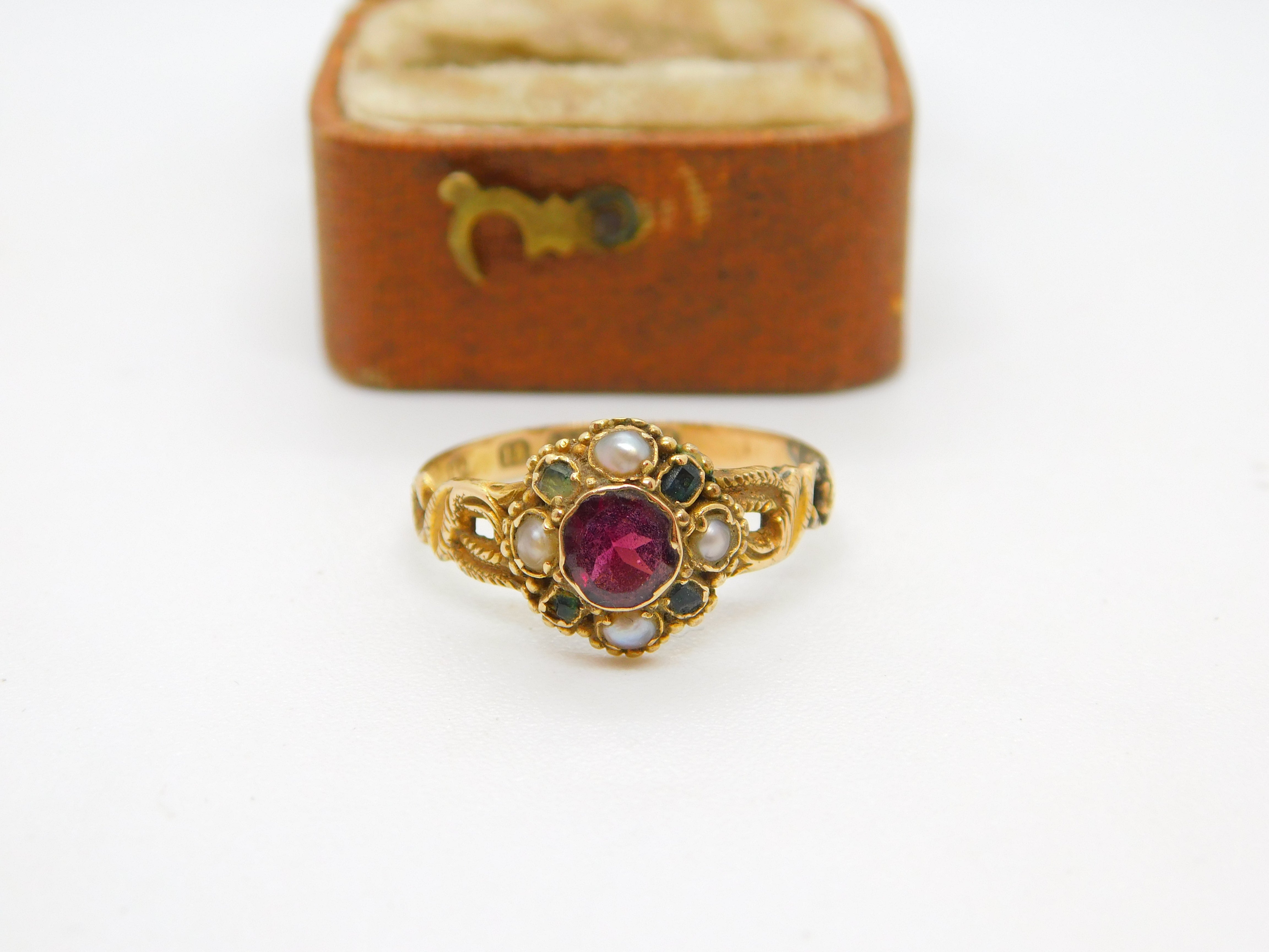 Victorian 15ct Gold, Garnet, Seed Pearl & Emerald Dress Ring 1888 Birmingham