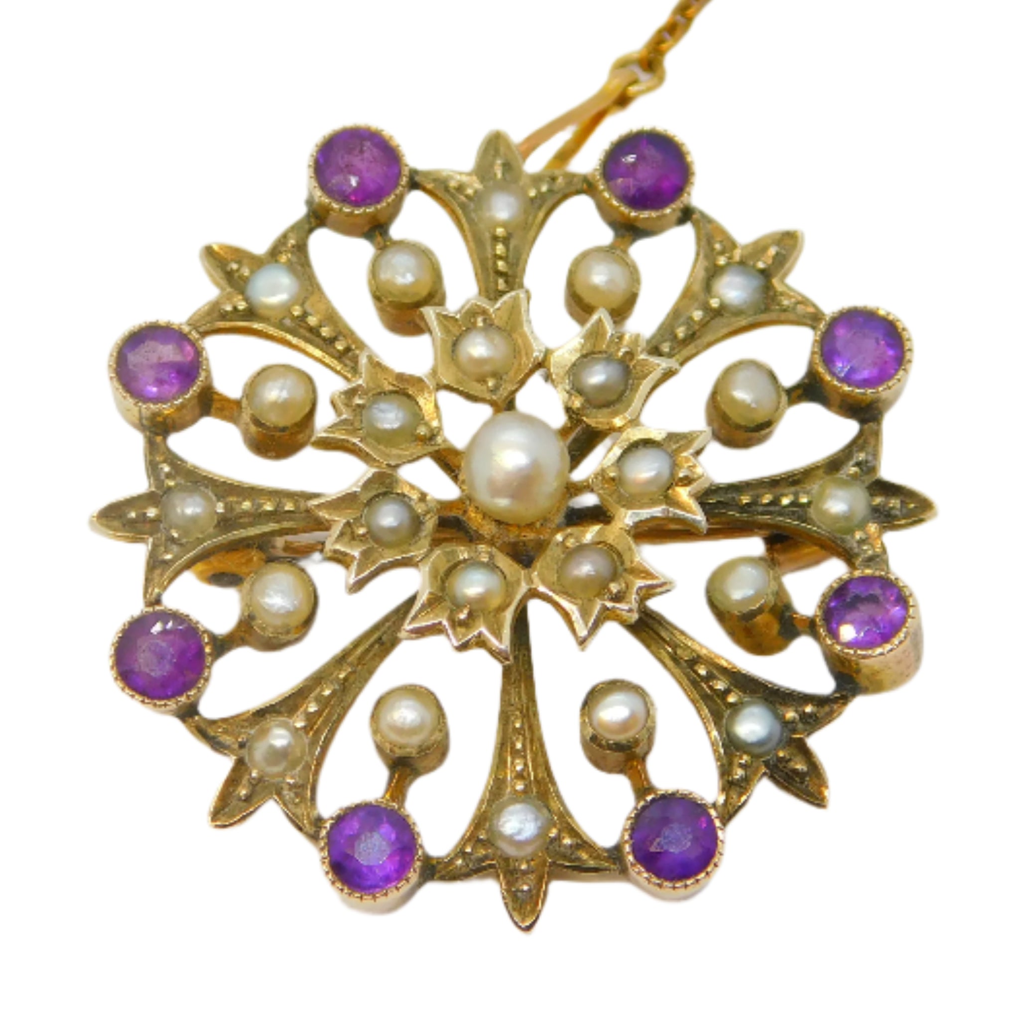 Victorian 15ct Yellow Gold, Amethyst & Seed Pearl Floral Brooch Antique c1890