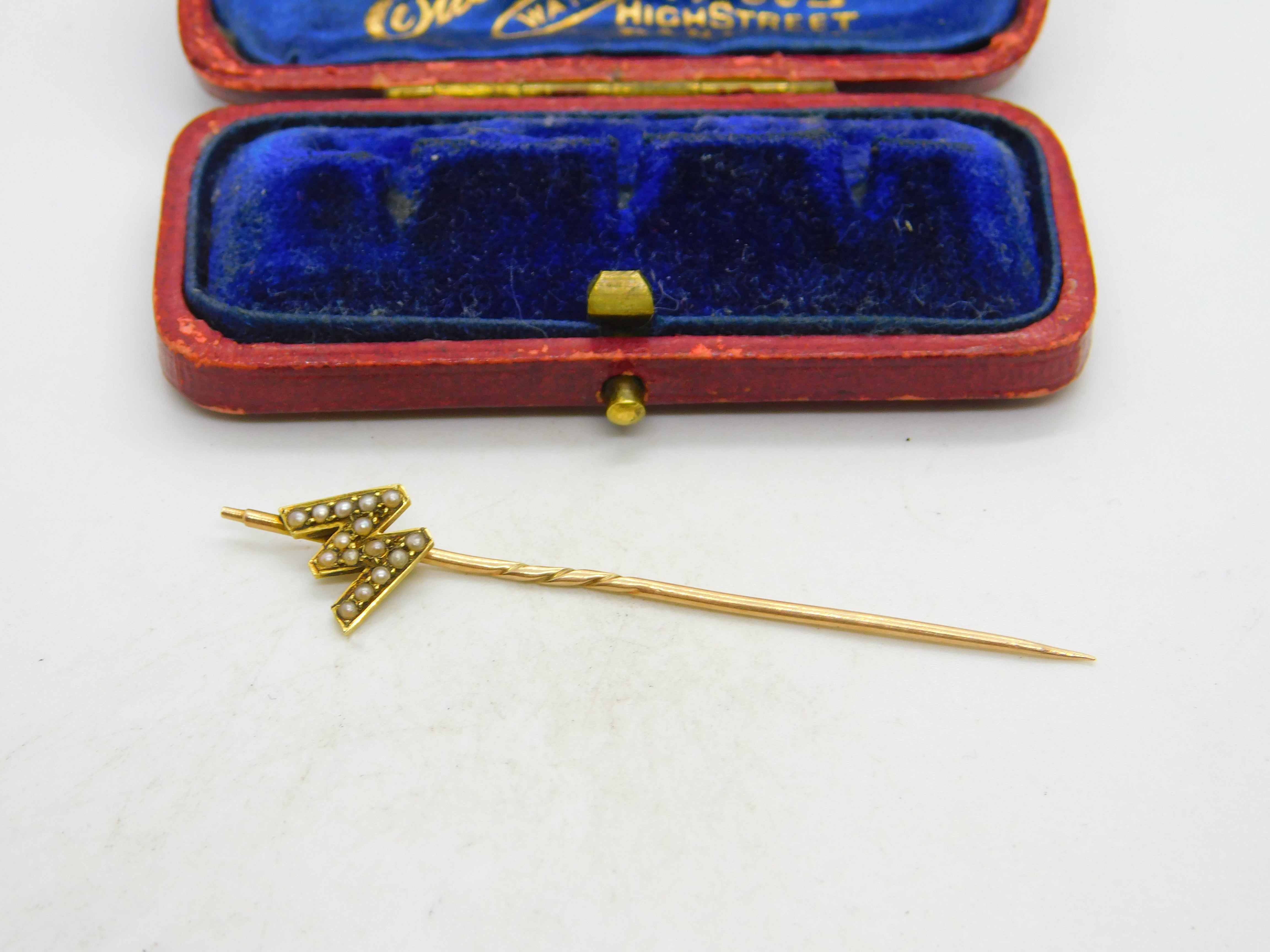 Victorian 15ct Yellow Gold Seed Pearl Set 'W' Initial Stick Pin Antique c1890