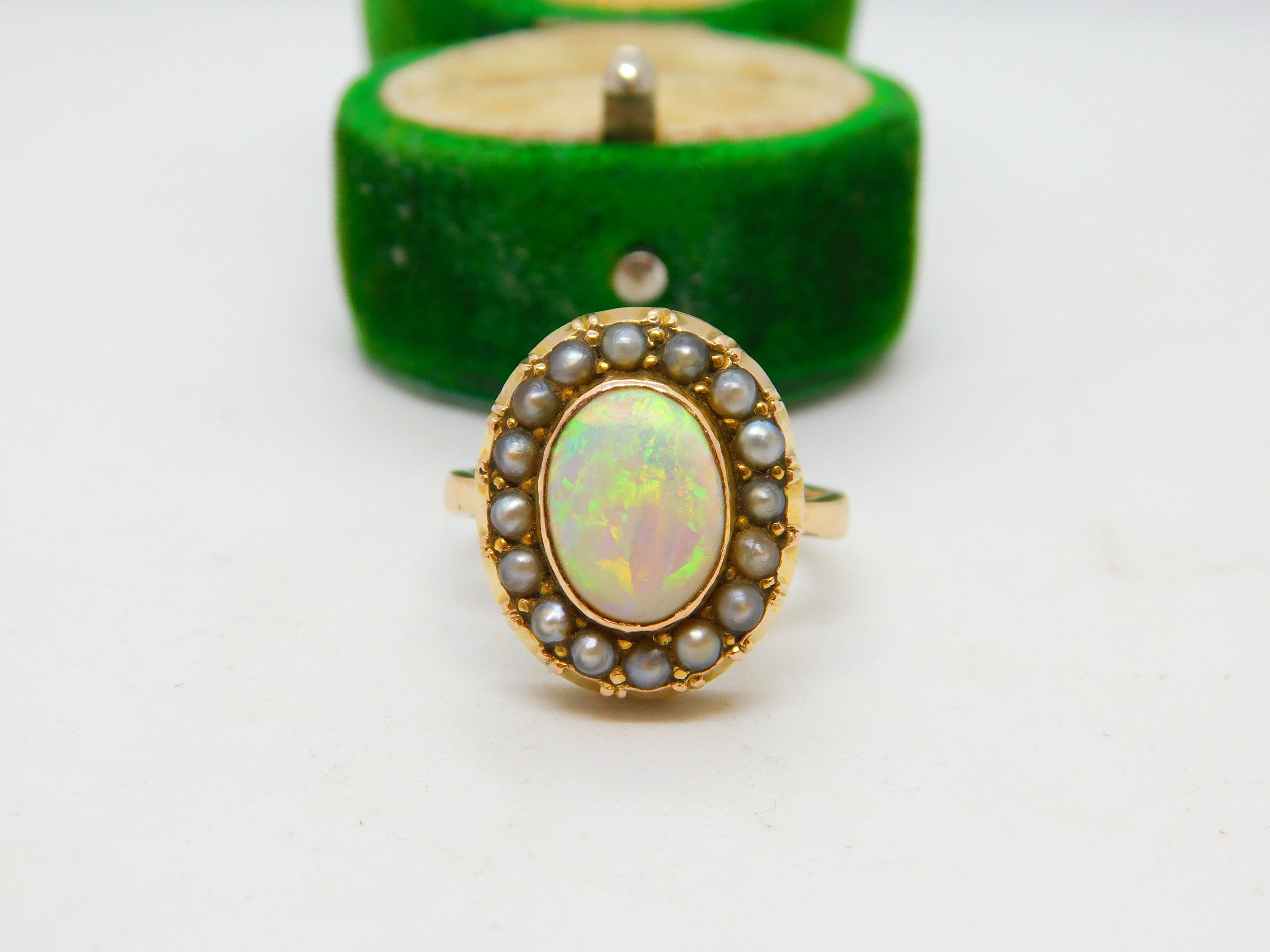 Victorian 18ct Gold Cabochon White Opal & Seed Pearl Dress Ring Antique c1860