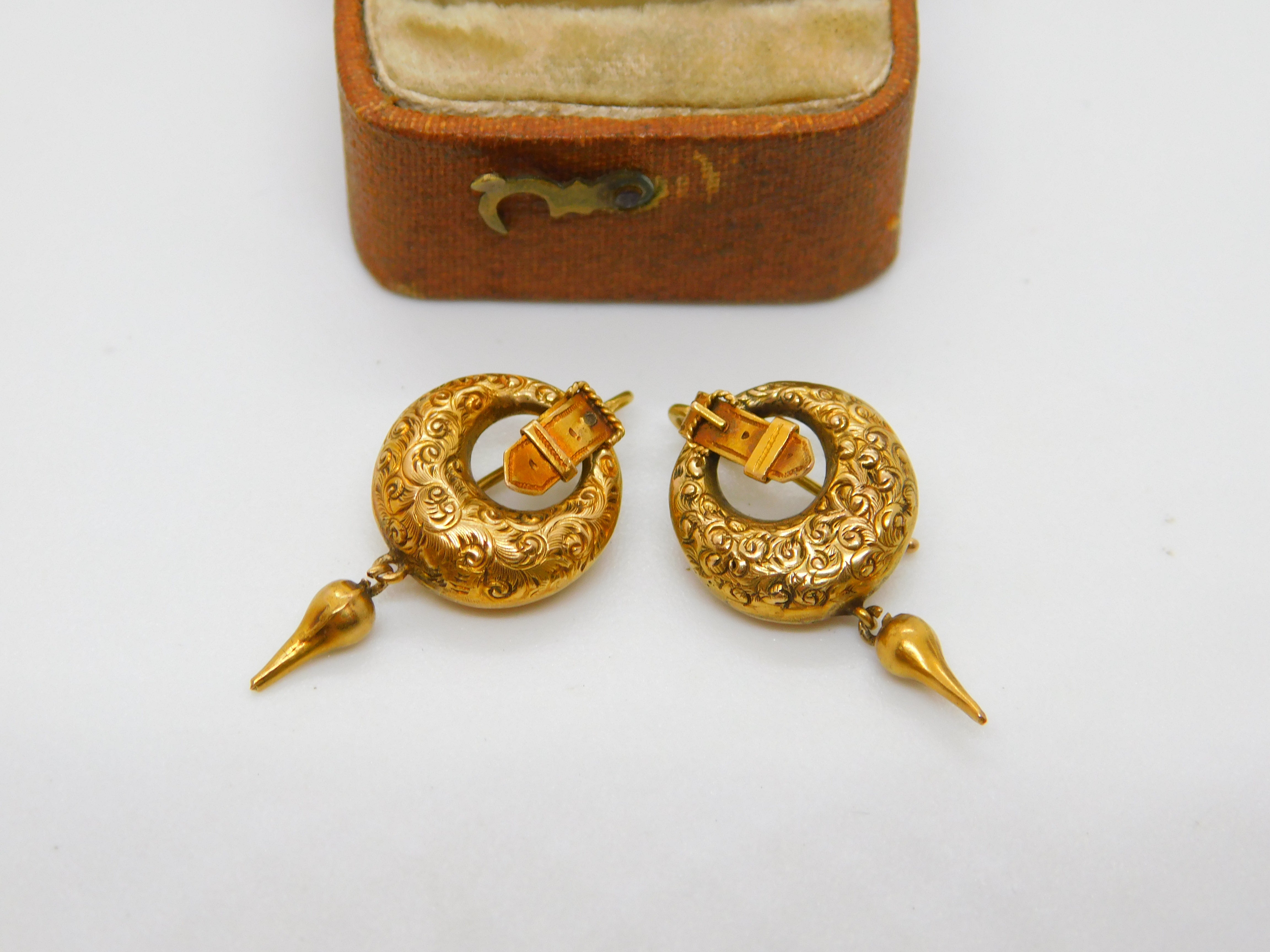Victorian 18ct Yellow Gold Etruscan Style Buckle Drop Earrings Antique c1860
