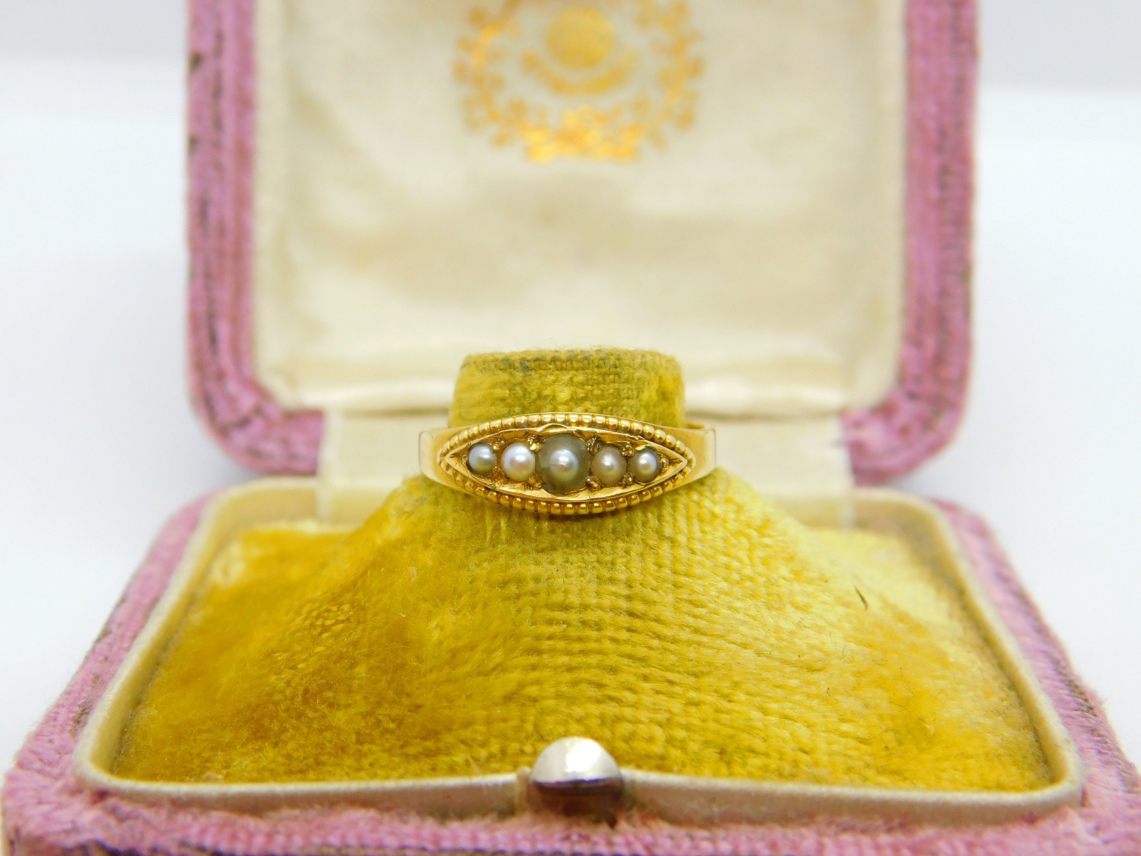 Victorian 18ct Yellow Gold Graduating Seed Pearl Boat Ring Antique c1860