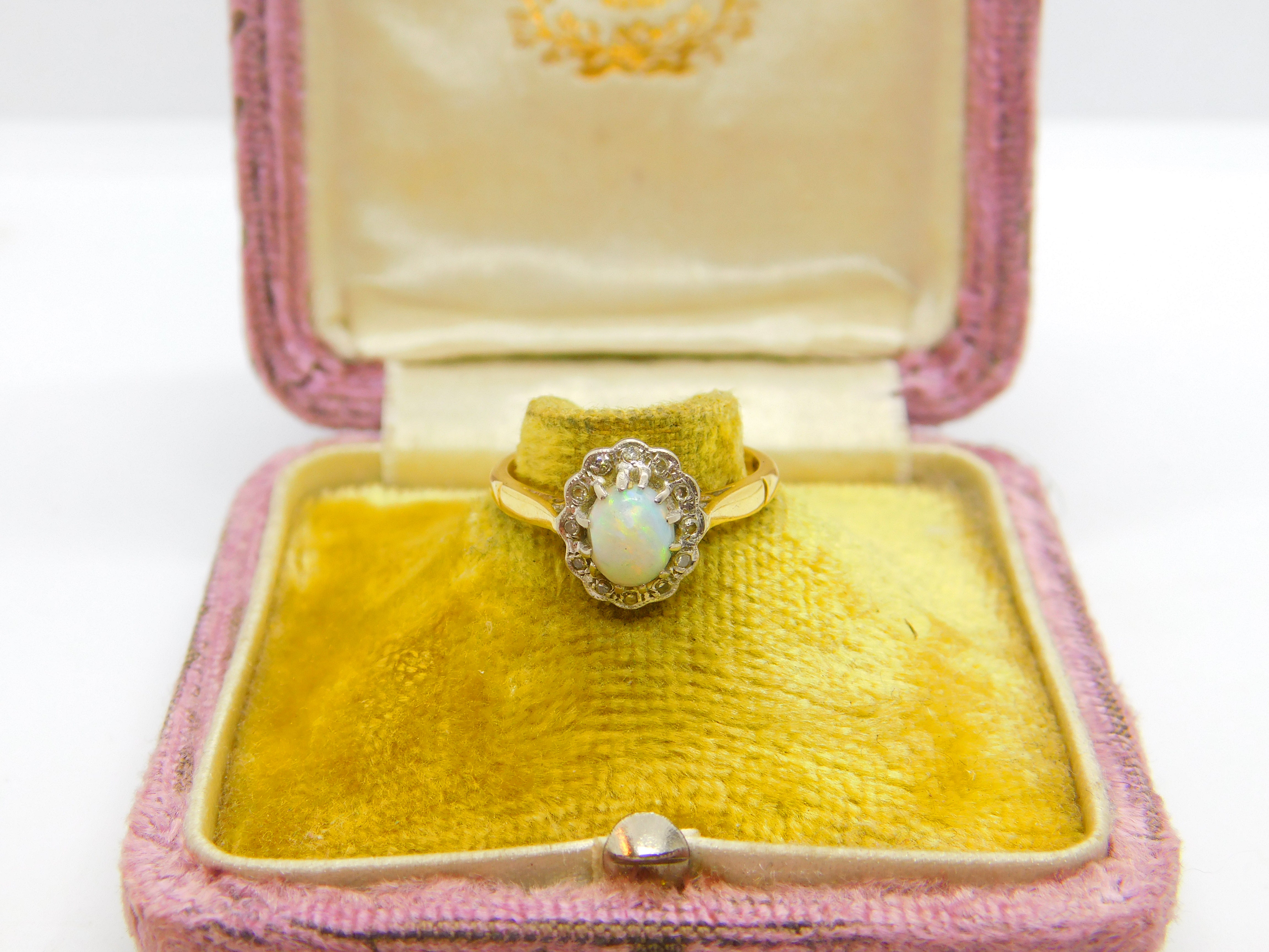 Victorian 18ct Yellow Gold, Cabochon Opal & Diamond Floral Cluster Ring c1890