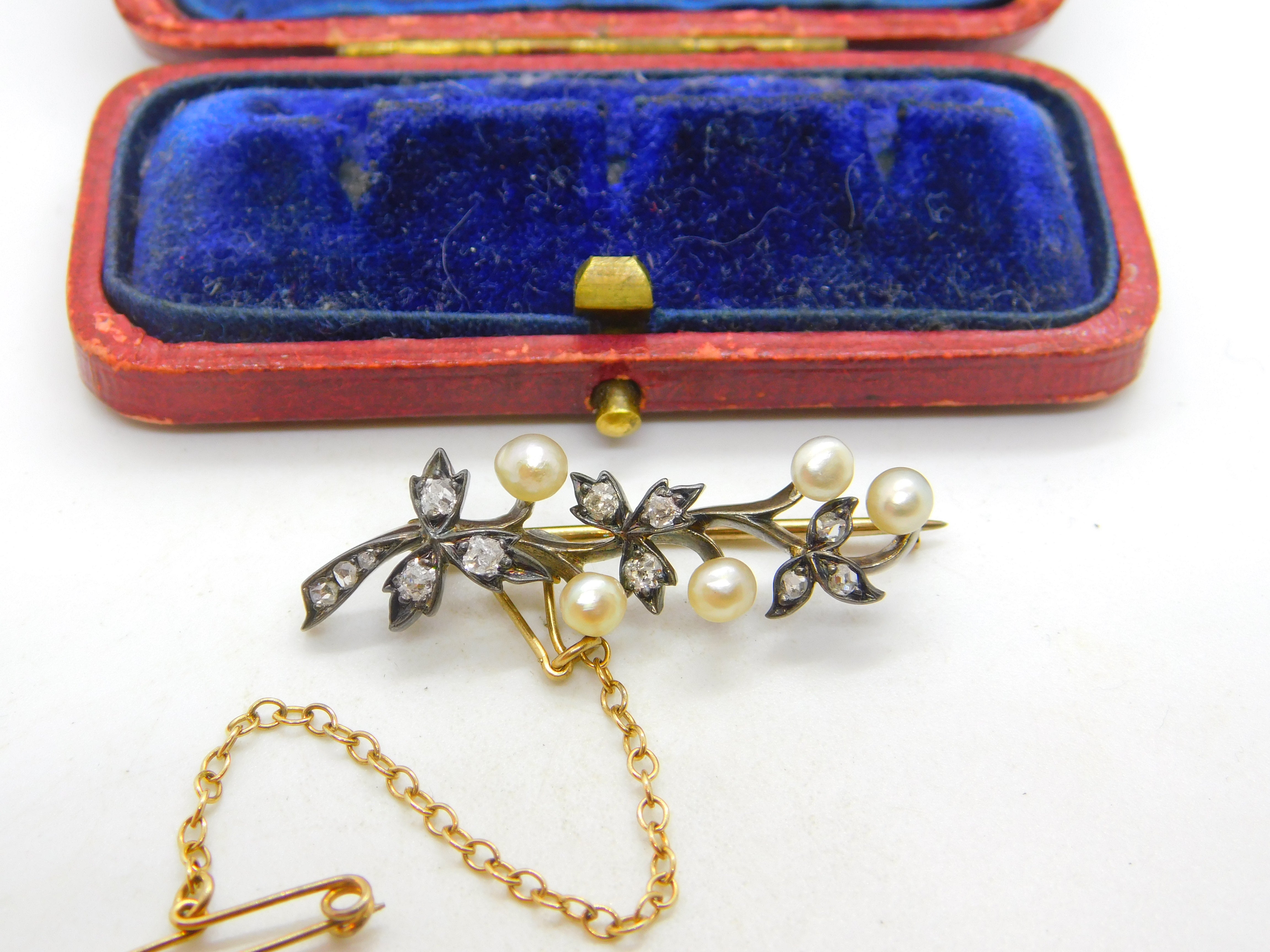 Victorian 18ct Yellow Gold, 0.5ct Diamond & Pearl Floral Brooch c1860 Antique