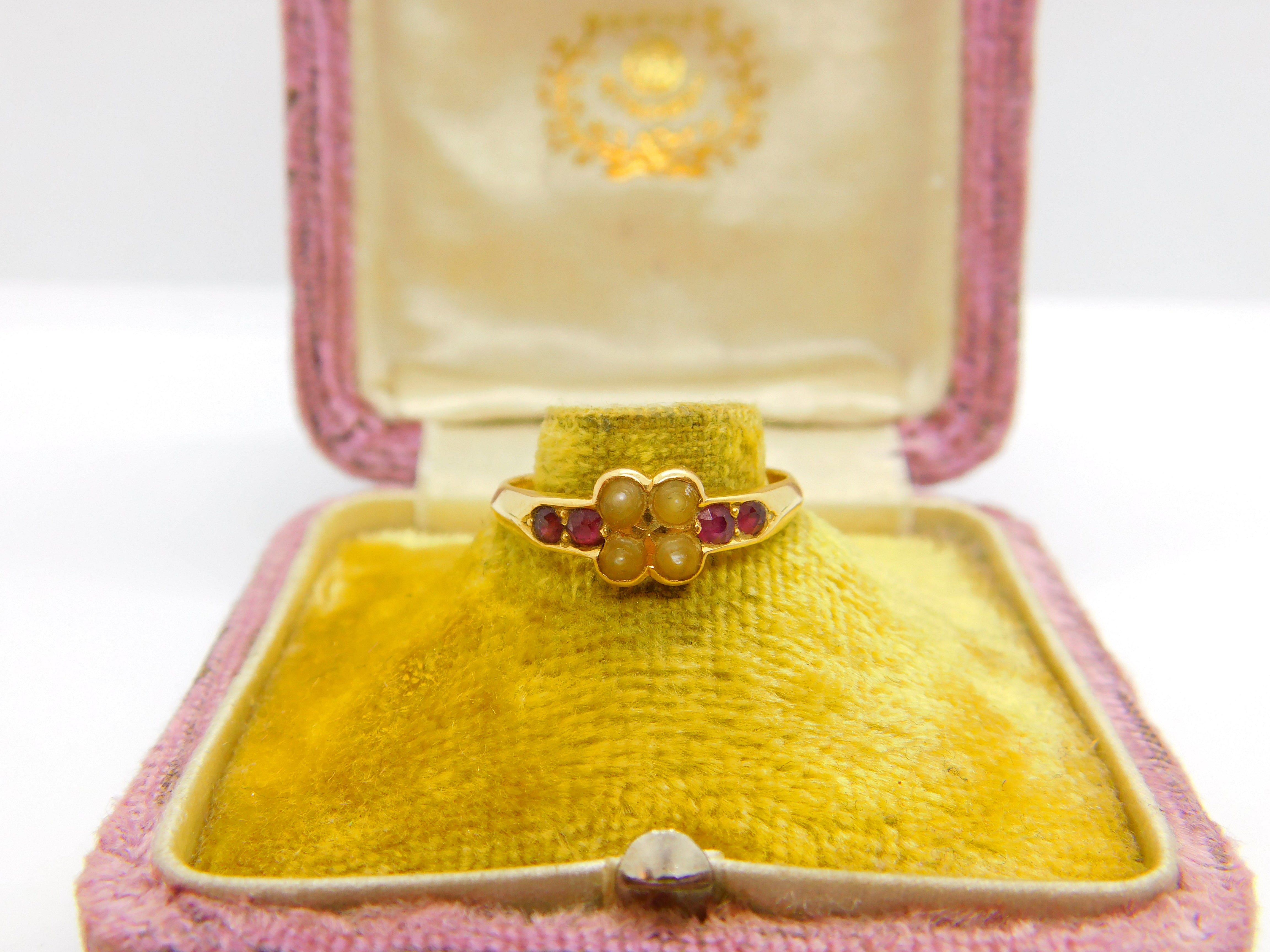 Victorian 18ct Yellow Gold, Seed Pearl & Ruby Floral Ring 1891 Birmingham