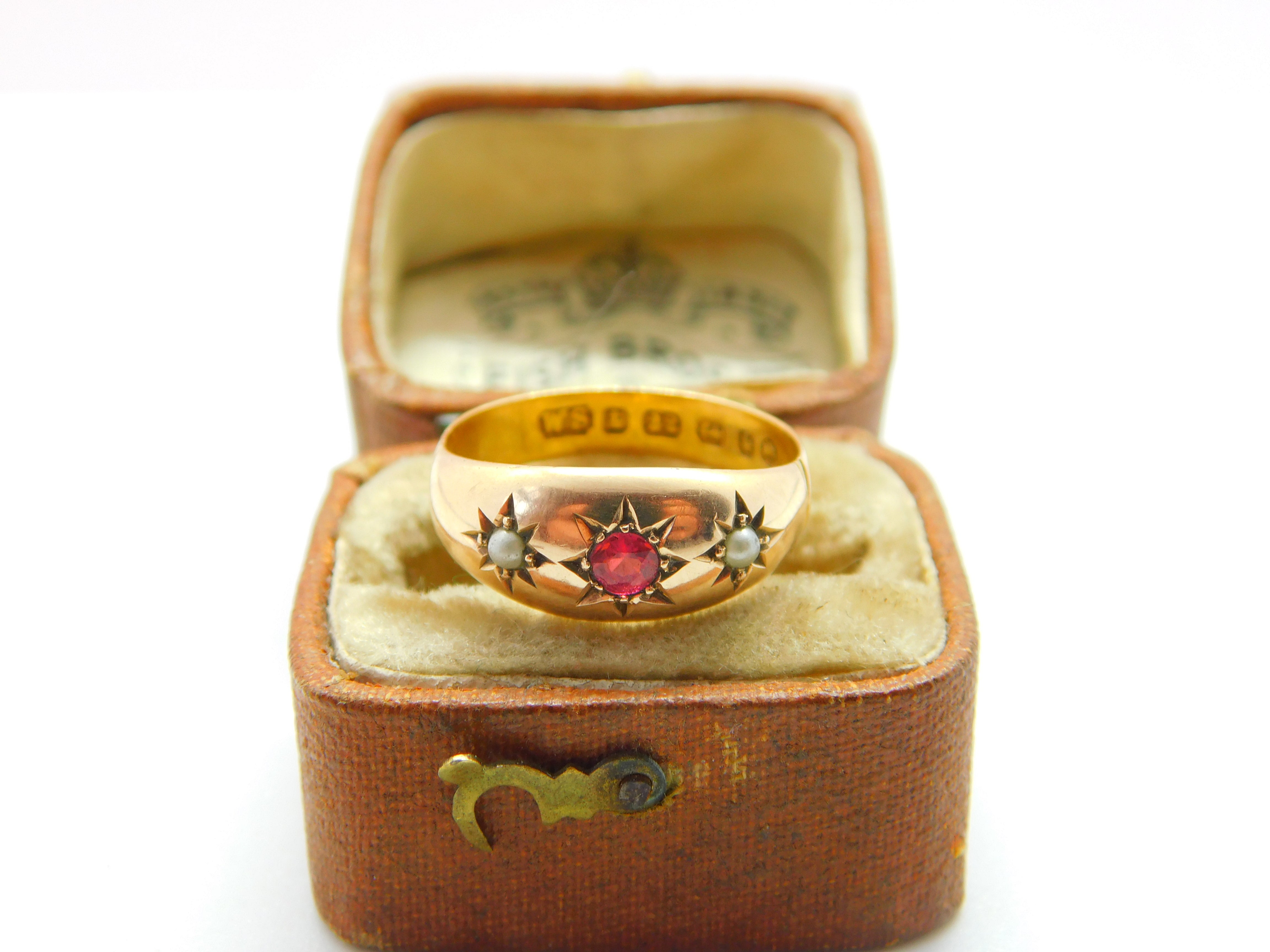 Victorian 22ct Yellow Gold, Ruby & Seed Pearl Boat Ring 1884 Birmingham Antique