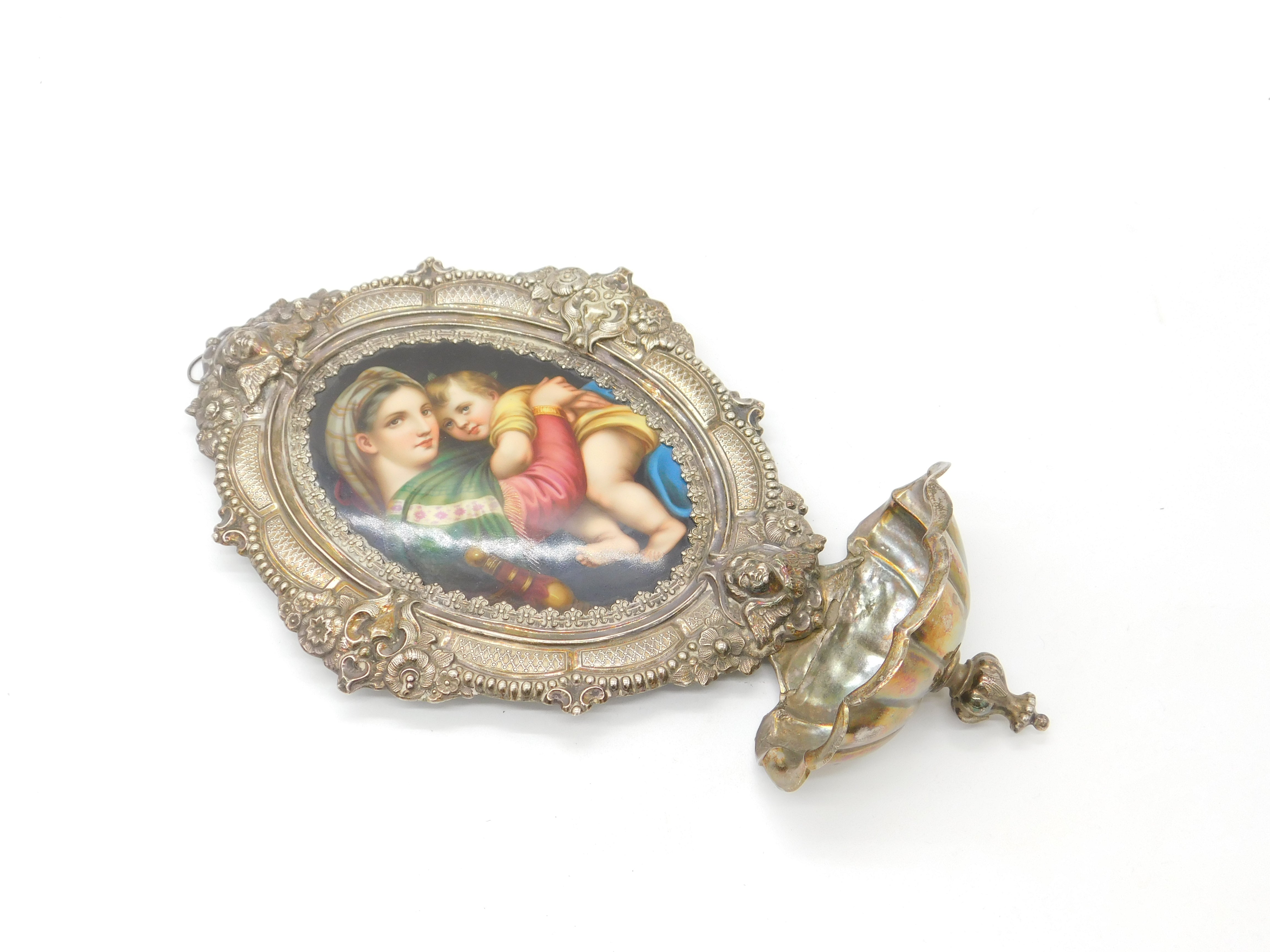 Victorian 800 Silver & Hand Painted Porcelain Holy Water Cistern c1880 Antique