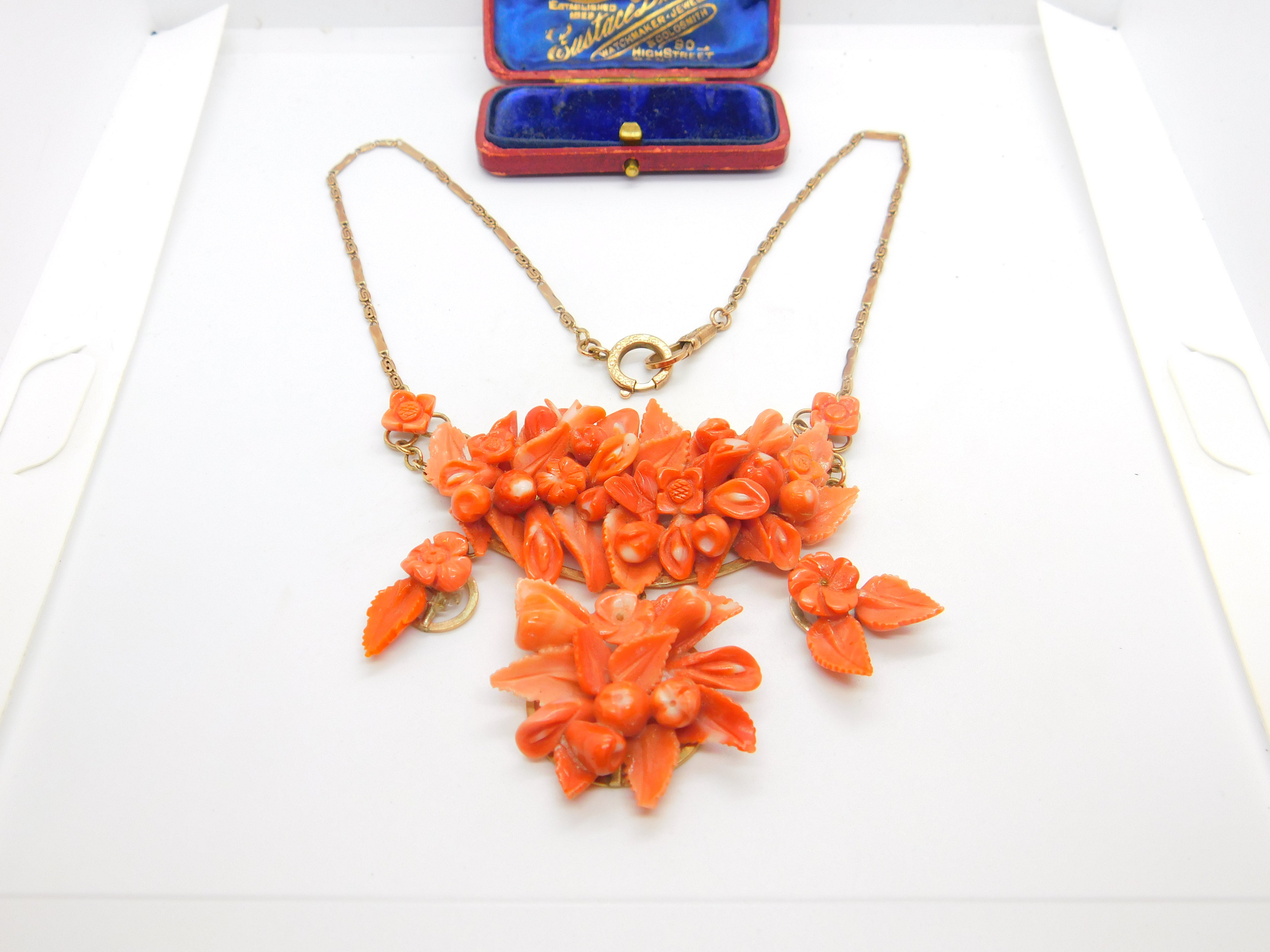 Victorian 8ct Rose Gold Large Carved Red Coral Floral Statement Necklace c1880