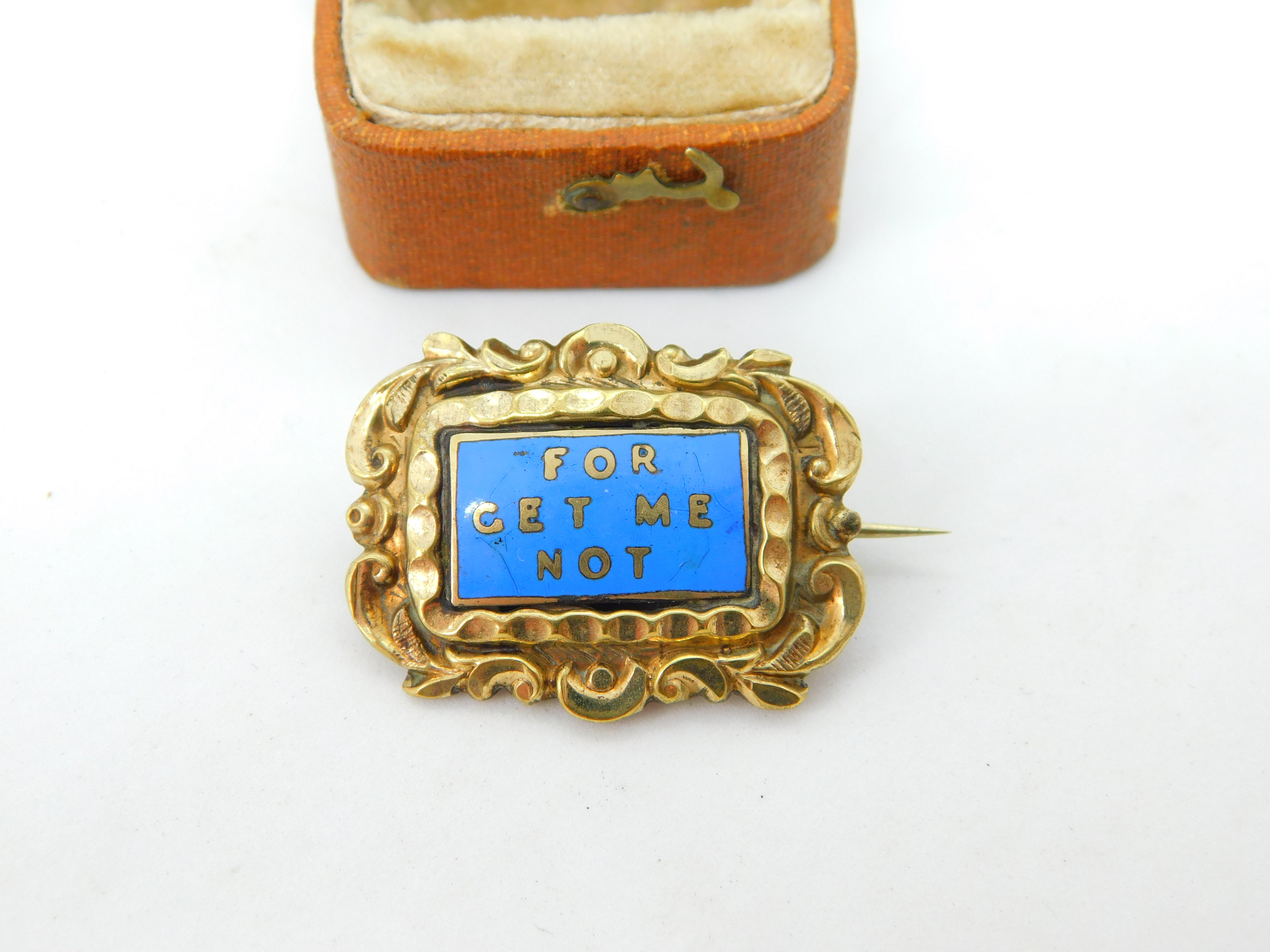 Victorian 9ct Gold Cased Blue Enamel 'For Get Me Not' Mourning Brooch Antique