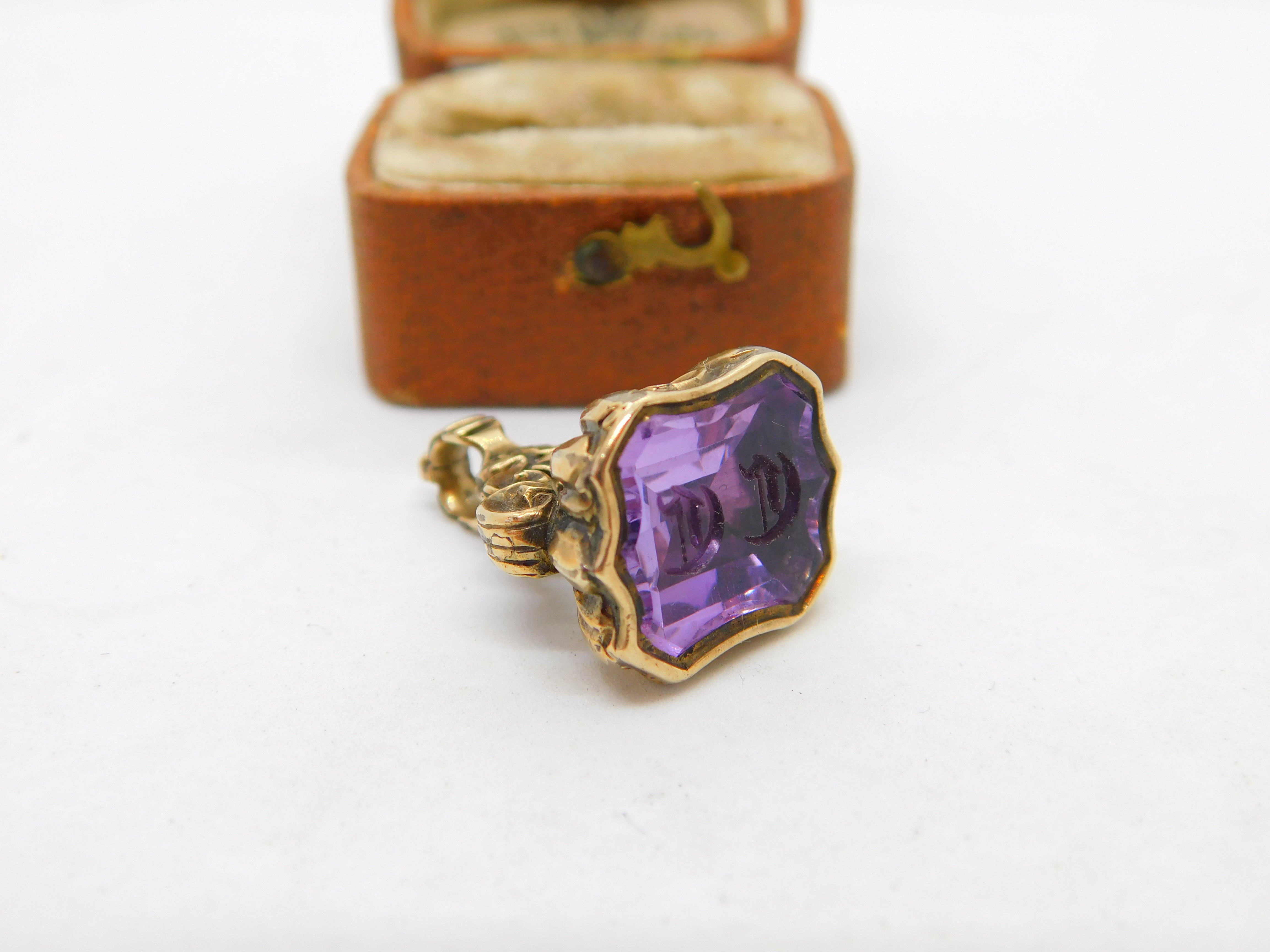 Victorian 9ct Gold Carved Amethyst 'C.C' Initial Intaglio Seal Fob c1860 Antique