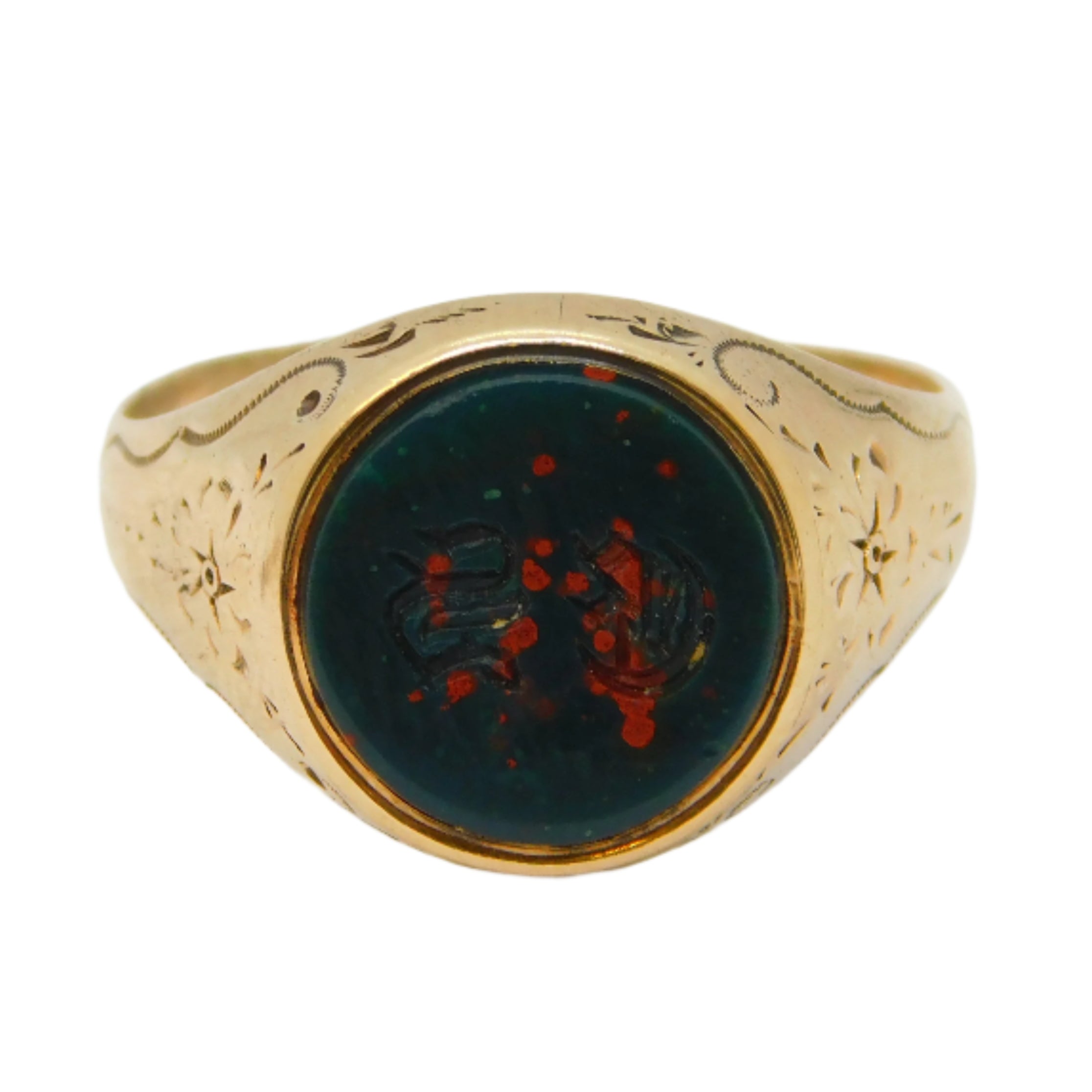 Victorian 9ct Gold Carved 'SG' Bloodstone Intaglio Signet Ring Antique c1860