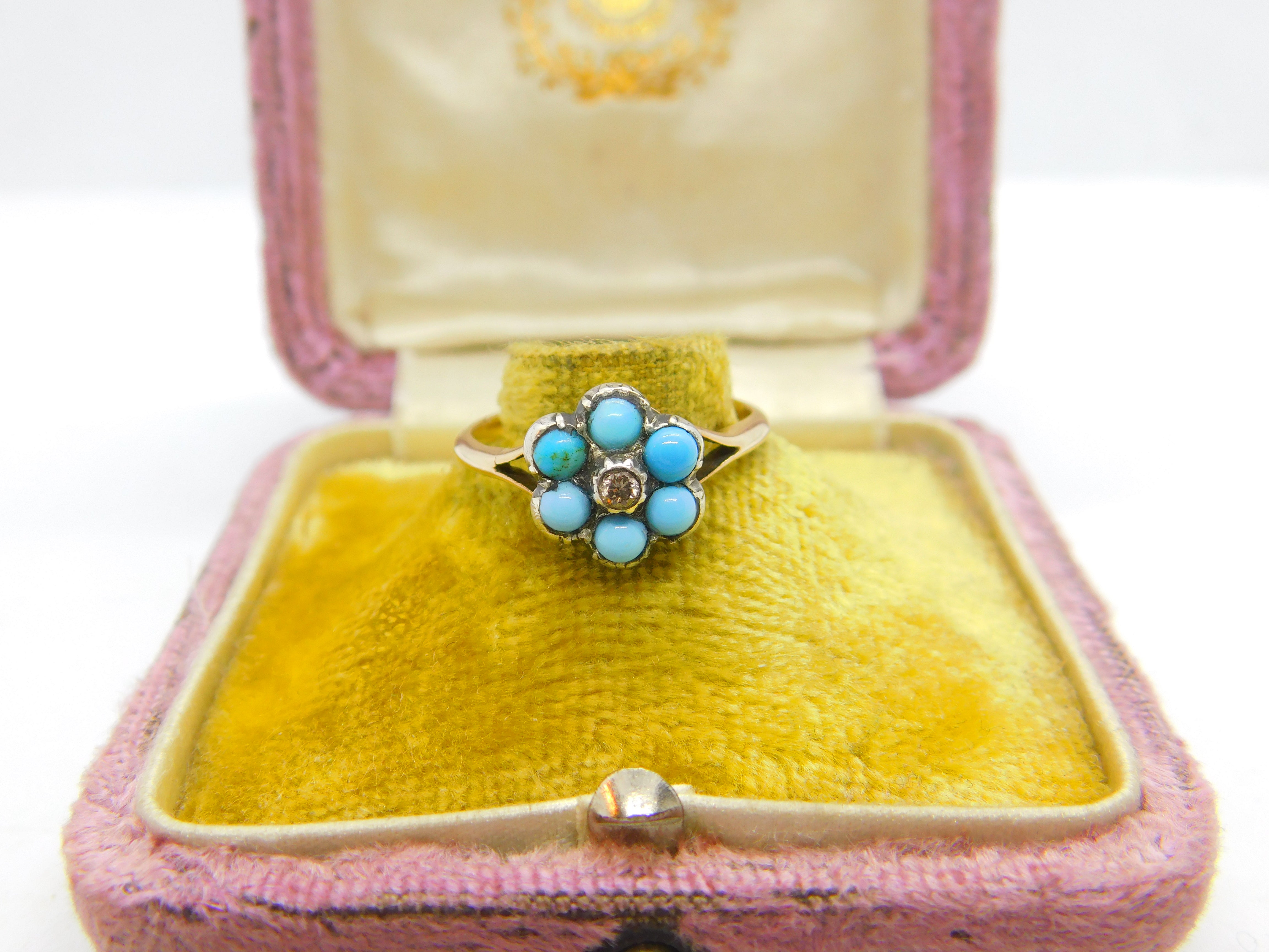 Victorian 9ct Gold, Turquoise & Diamond Floral Sweetheart Ring Antique c1860