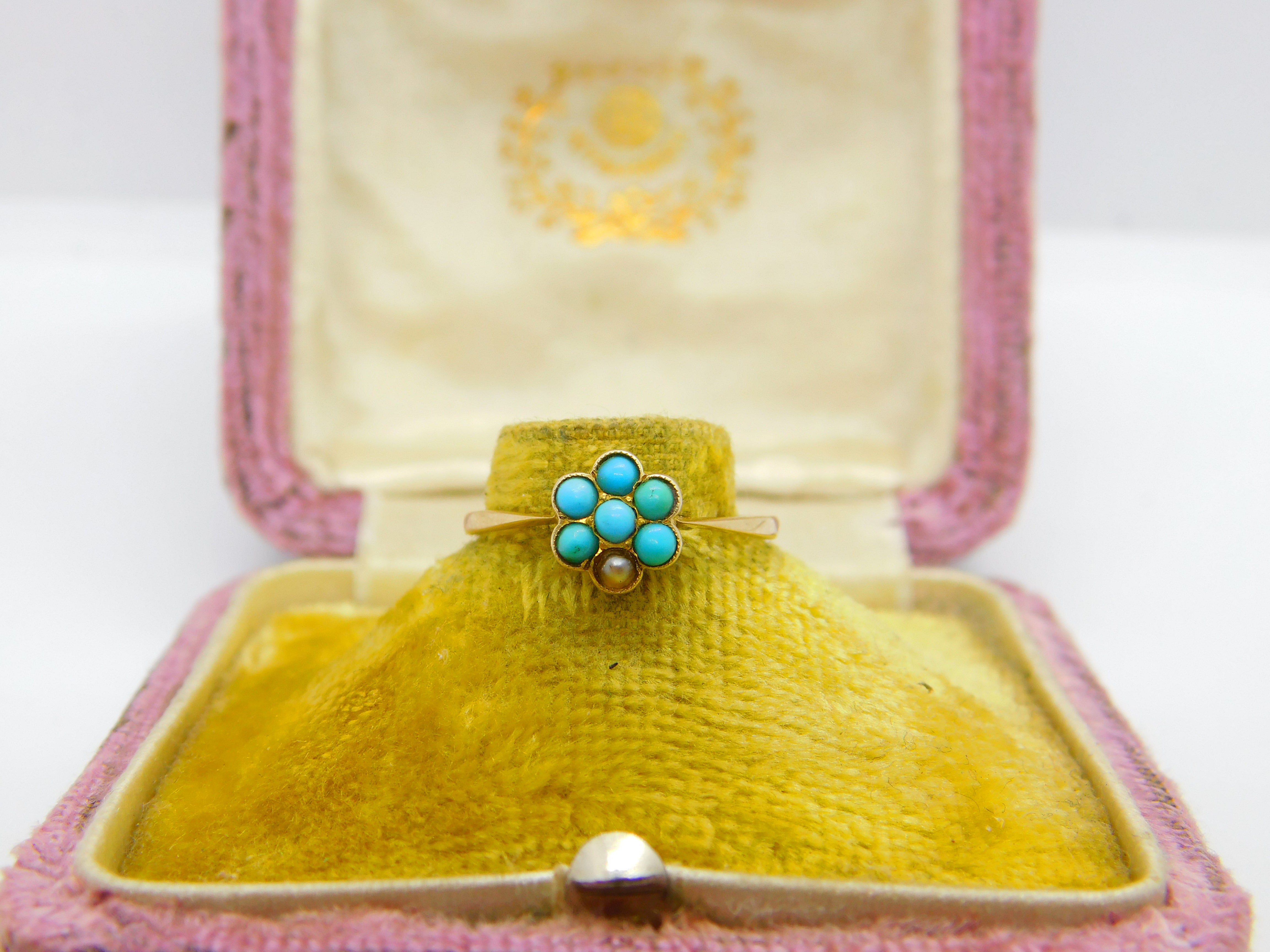 Victorian 9ct Gold, Seed Pearl & Turquoise Floral Cluster Ring c1890 Antique