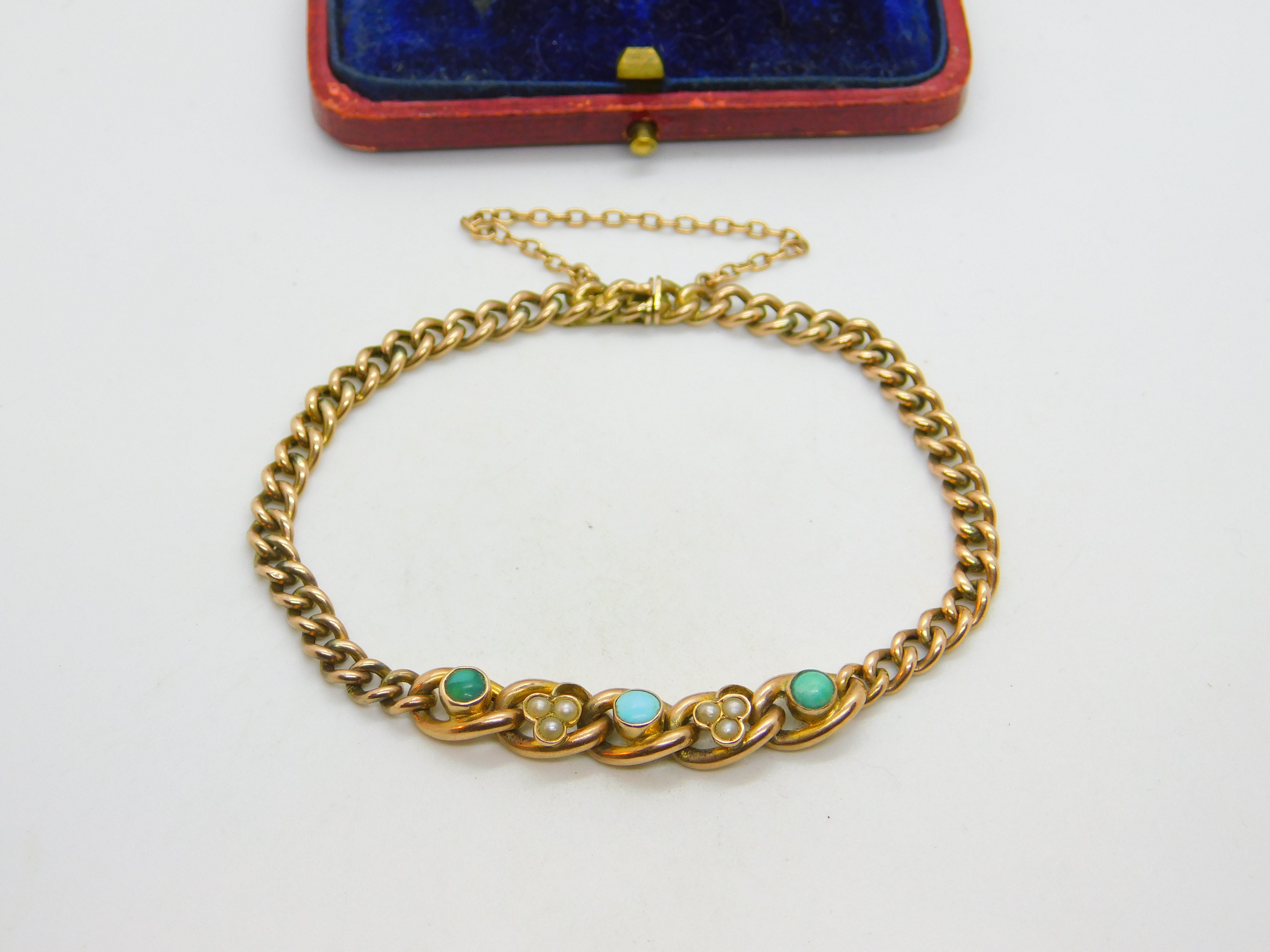 Victorian 9ct Rose Gold Graduating Turquoise & Seed Pearl Bracelet c1880 Antique