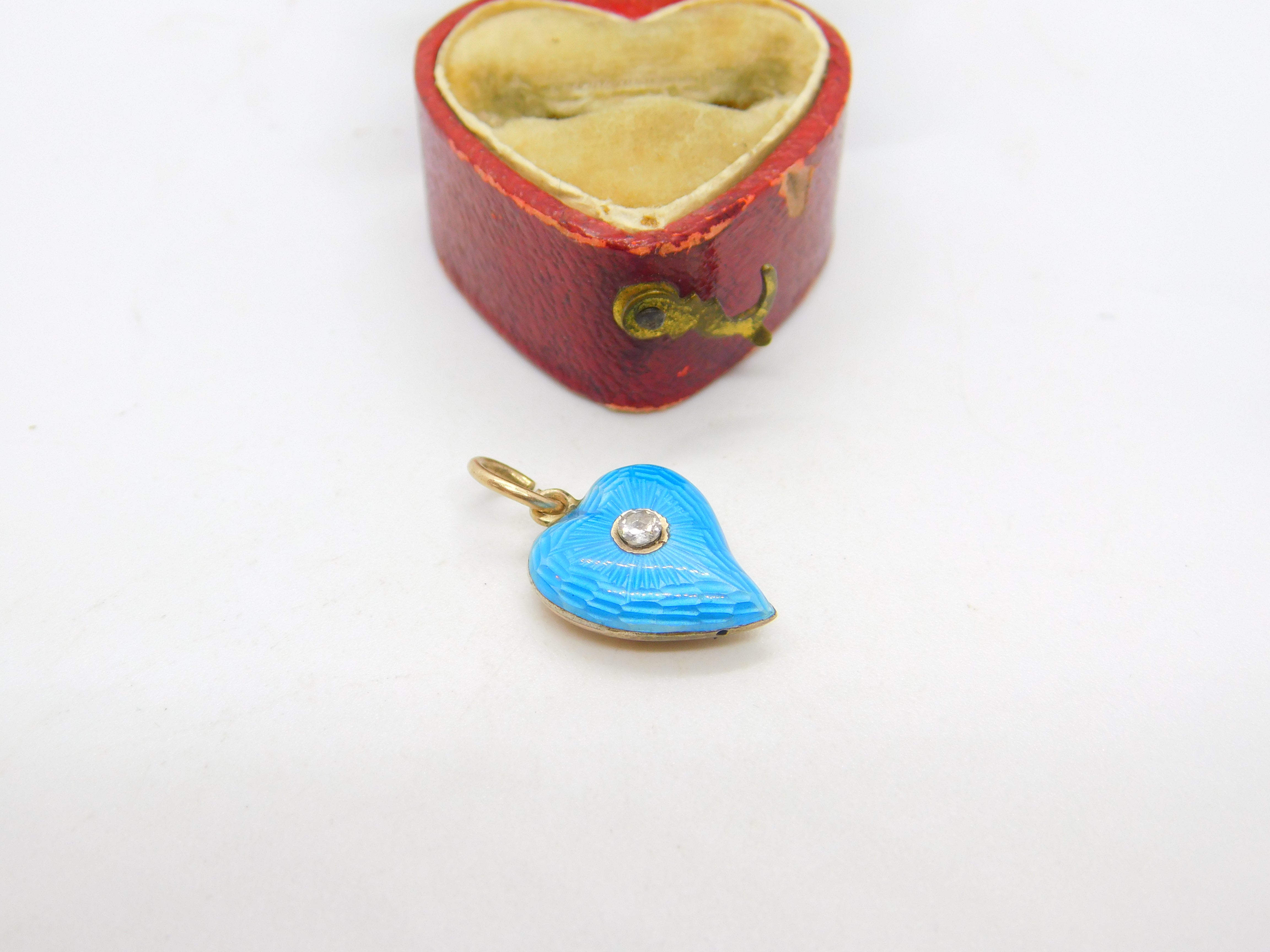 Victorian 9ct Yellow Gold Blue Guilloche Enamel Diamond Set Witches Heart c1860