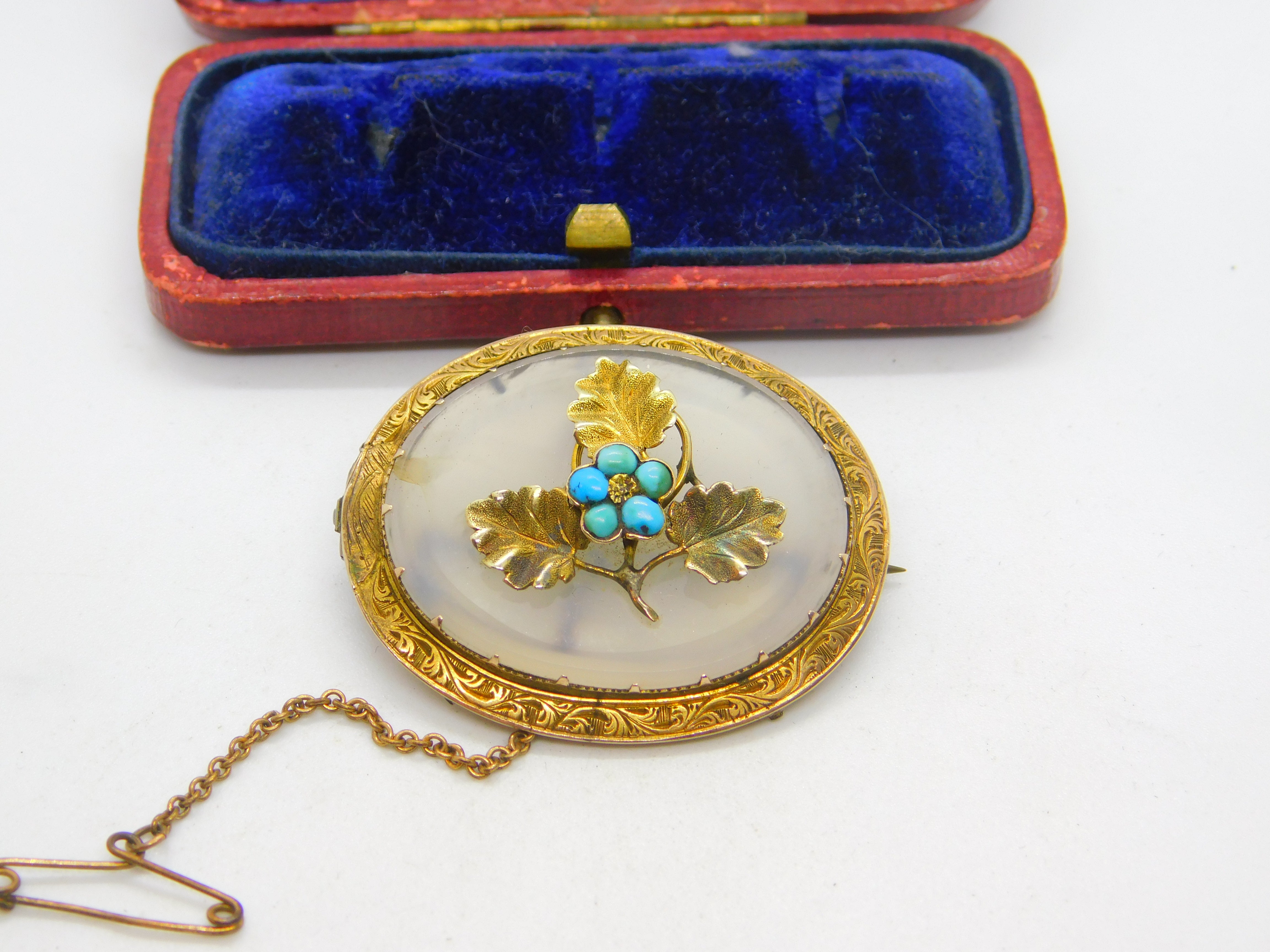 Victorian 9ct Yellow Gold, Chalcedony & Turquoise Set Oak Leaf Brooch c1860