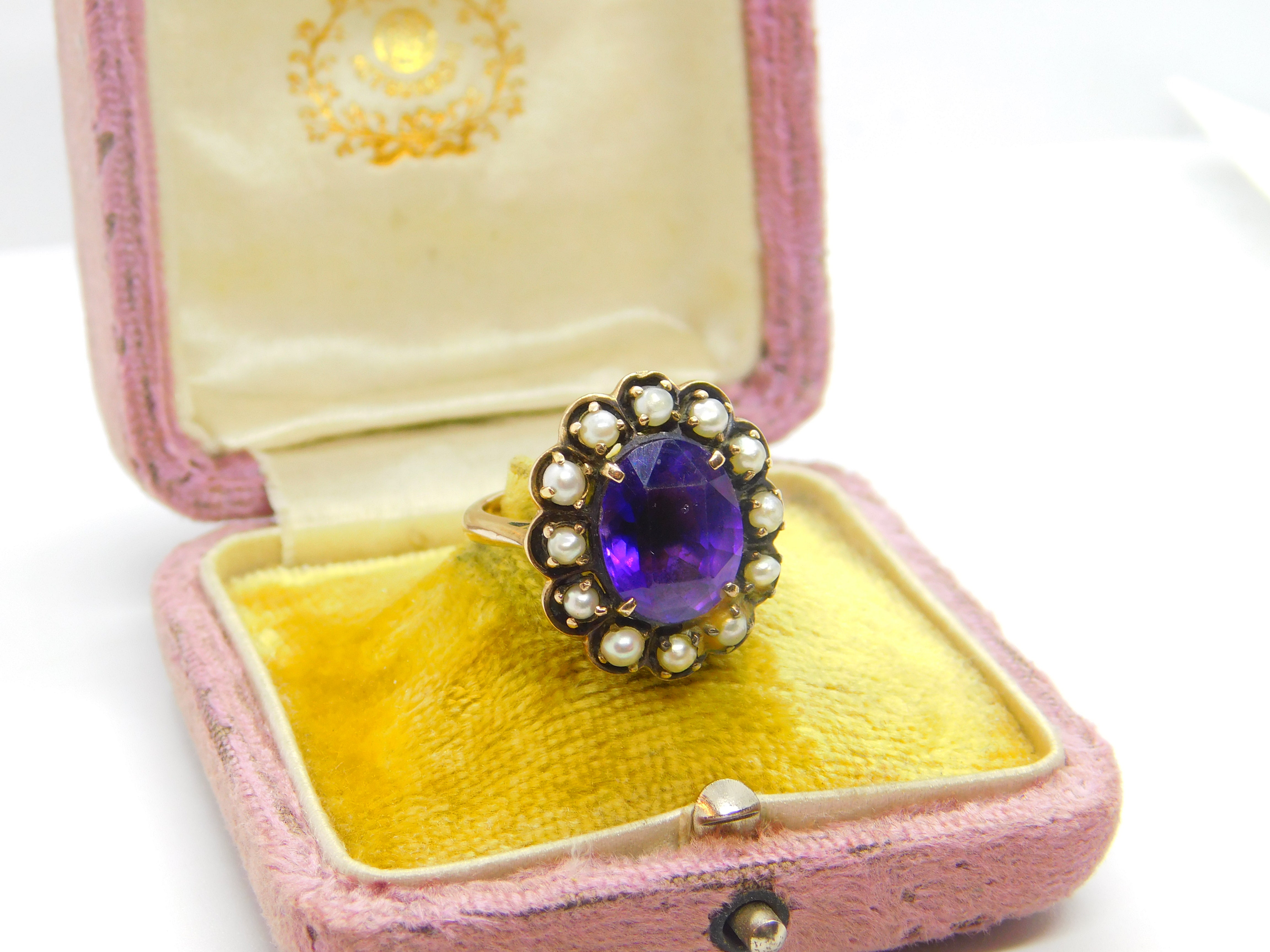 Victorian 9ct Yellow Gold, Amethyst & Pearl Set Floral Ring c1890 Antique