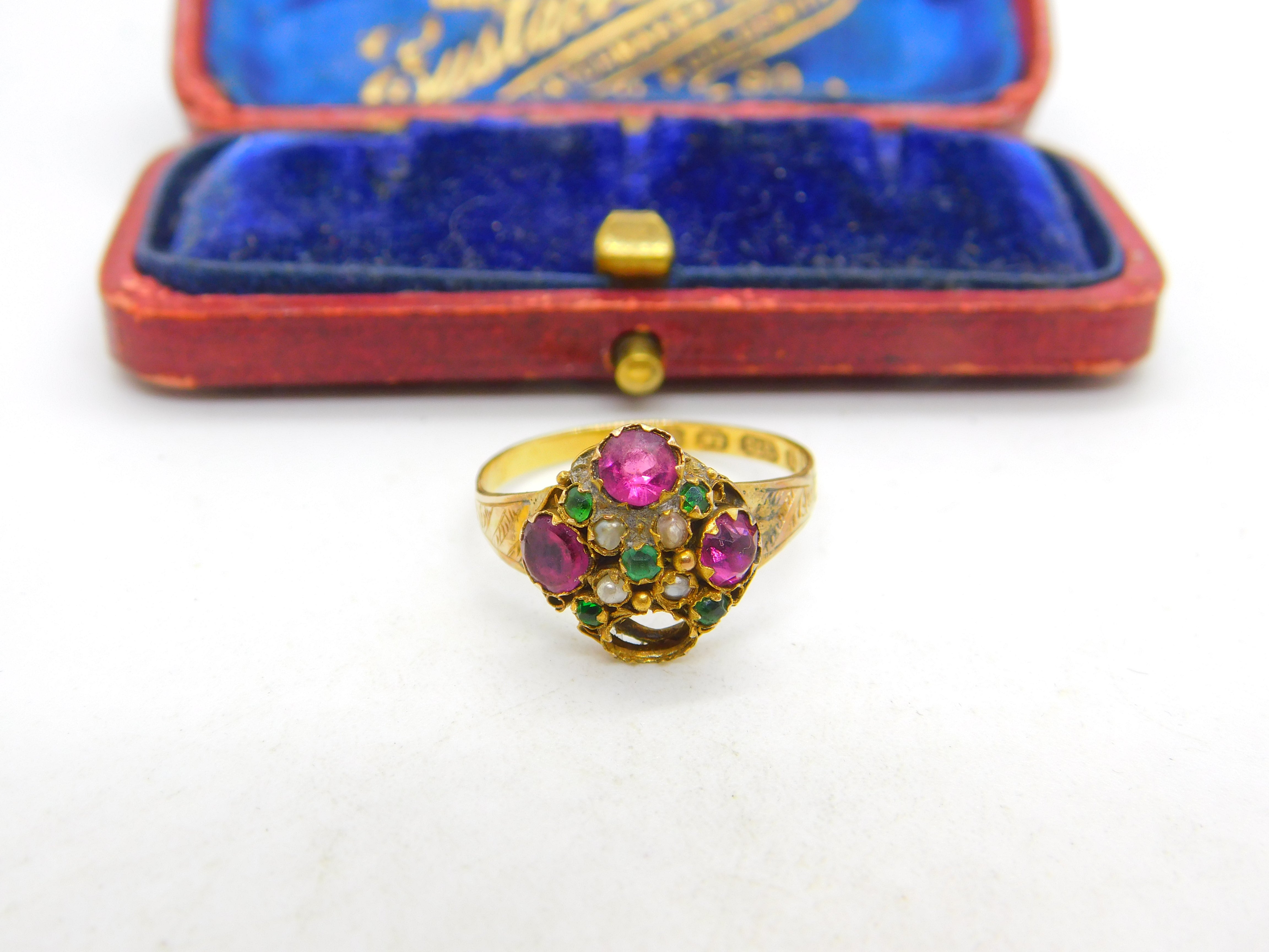 Victorian 9ct Yellow Gold, Amethyst, Seed Pearl & Paste Sweetheart Ring 1871 Birmingham