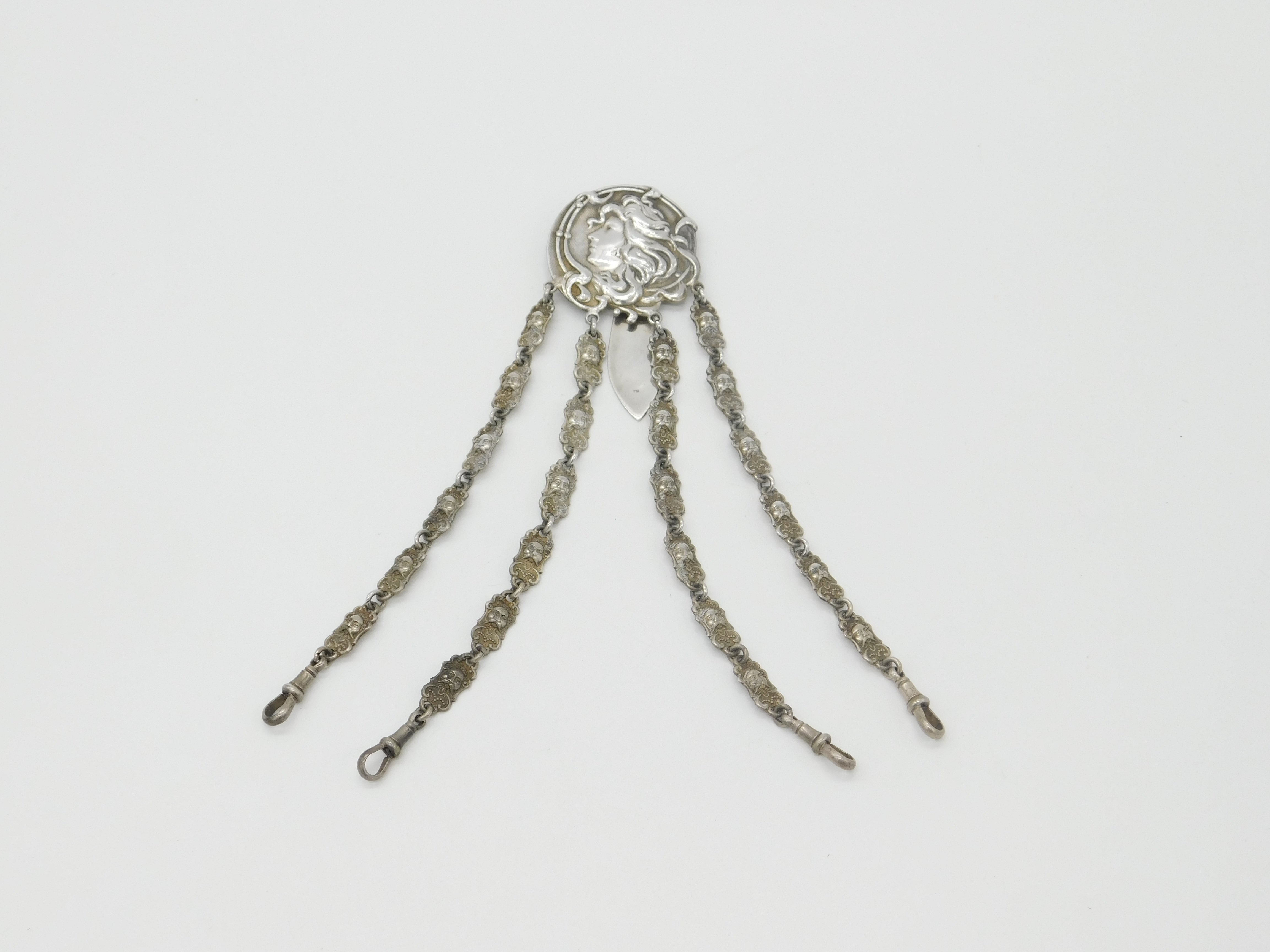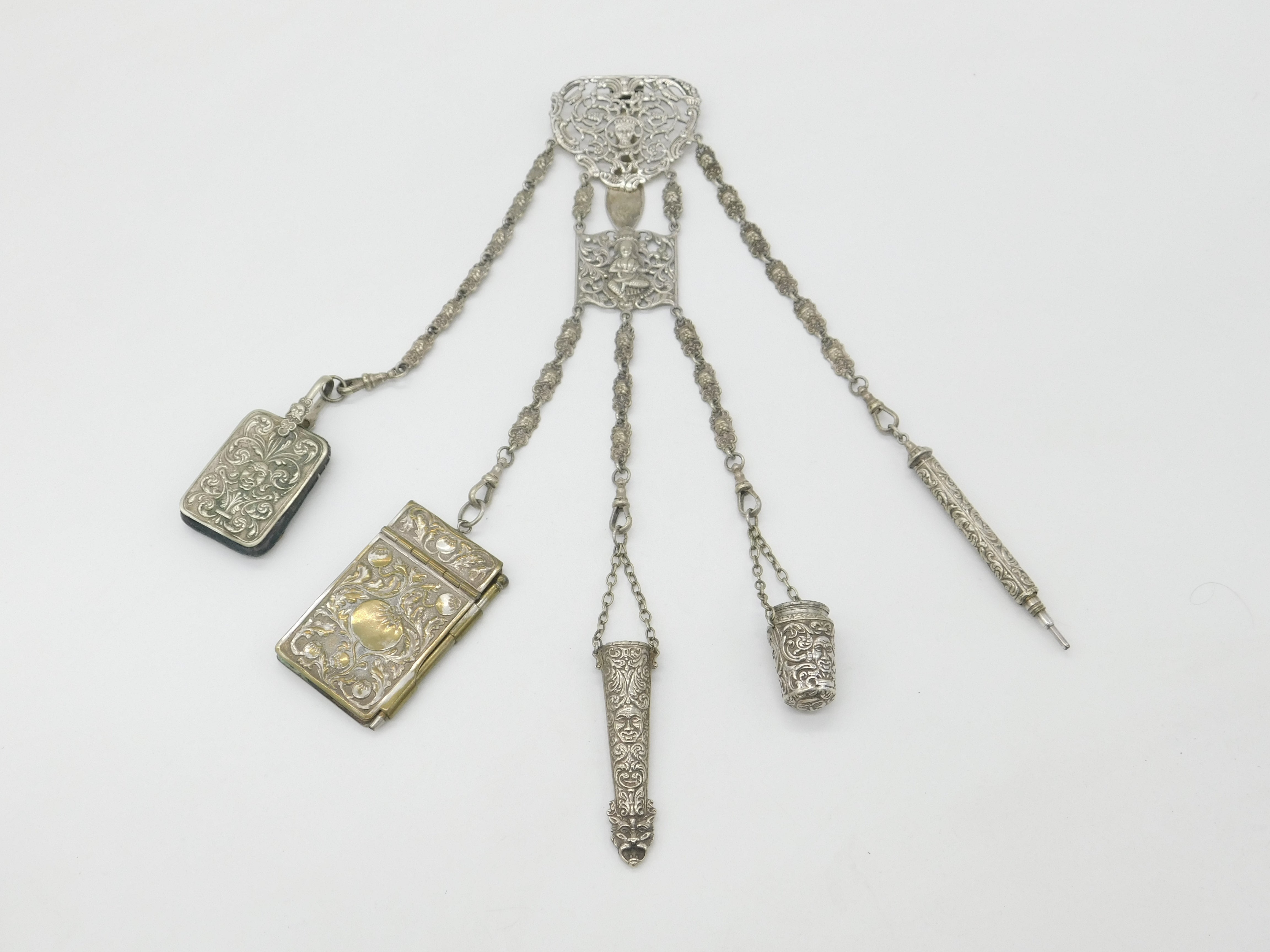 Victorian Art Nouveau Silver Plated Sewing Chatelaine with Tools c1880 Antique