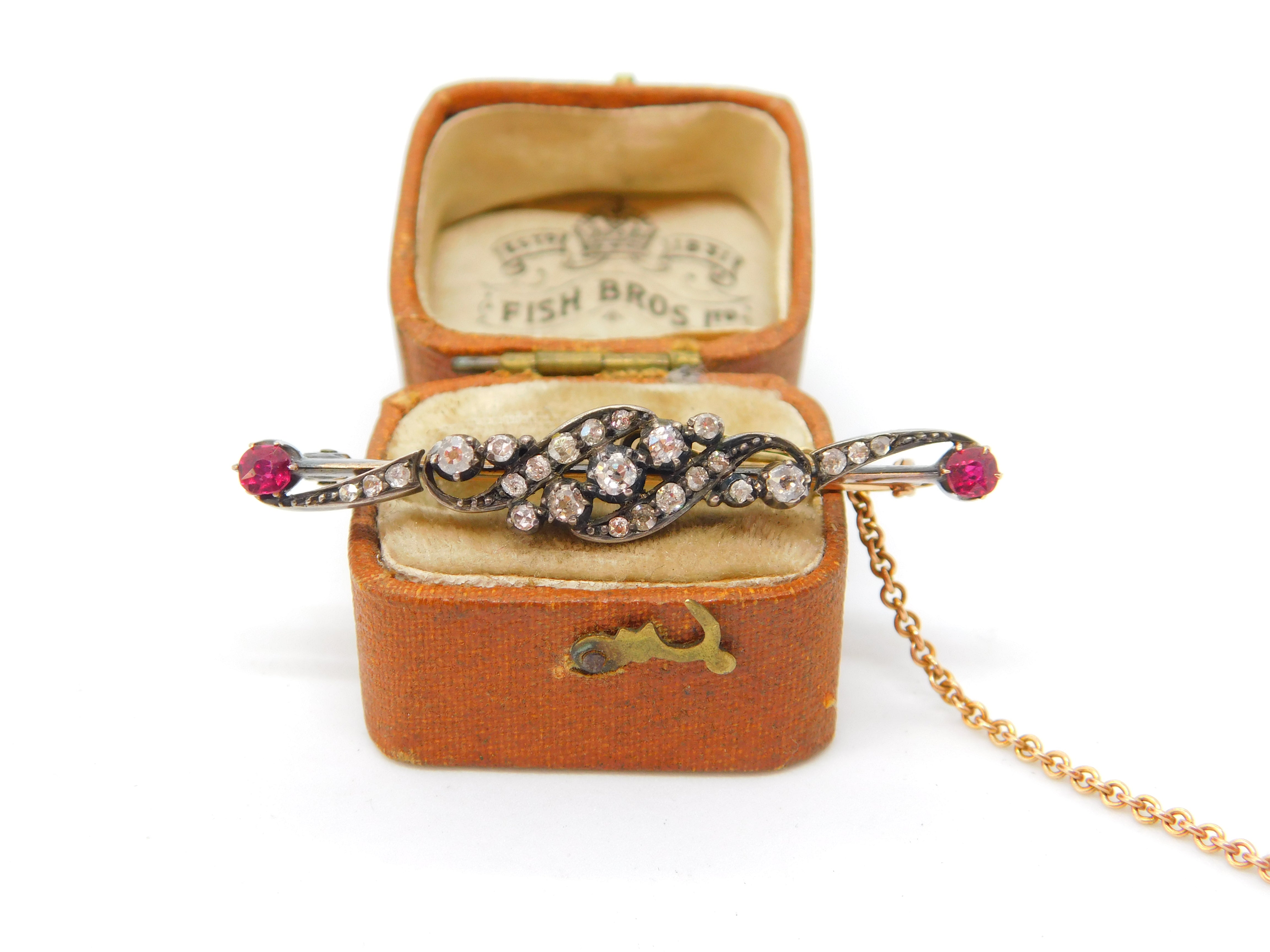 Victorian Belle Epoque 18ct Yellow Gold, Diamond & Ruby Brooch c1860 Antique
