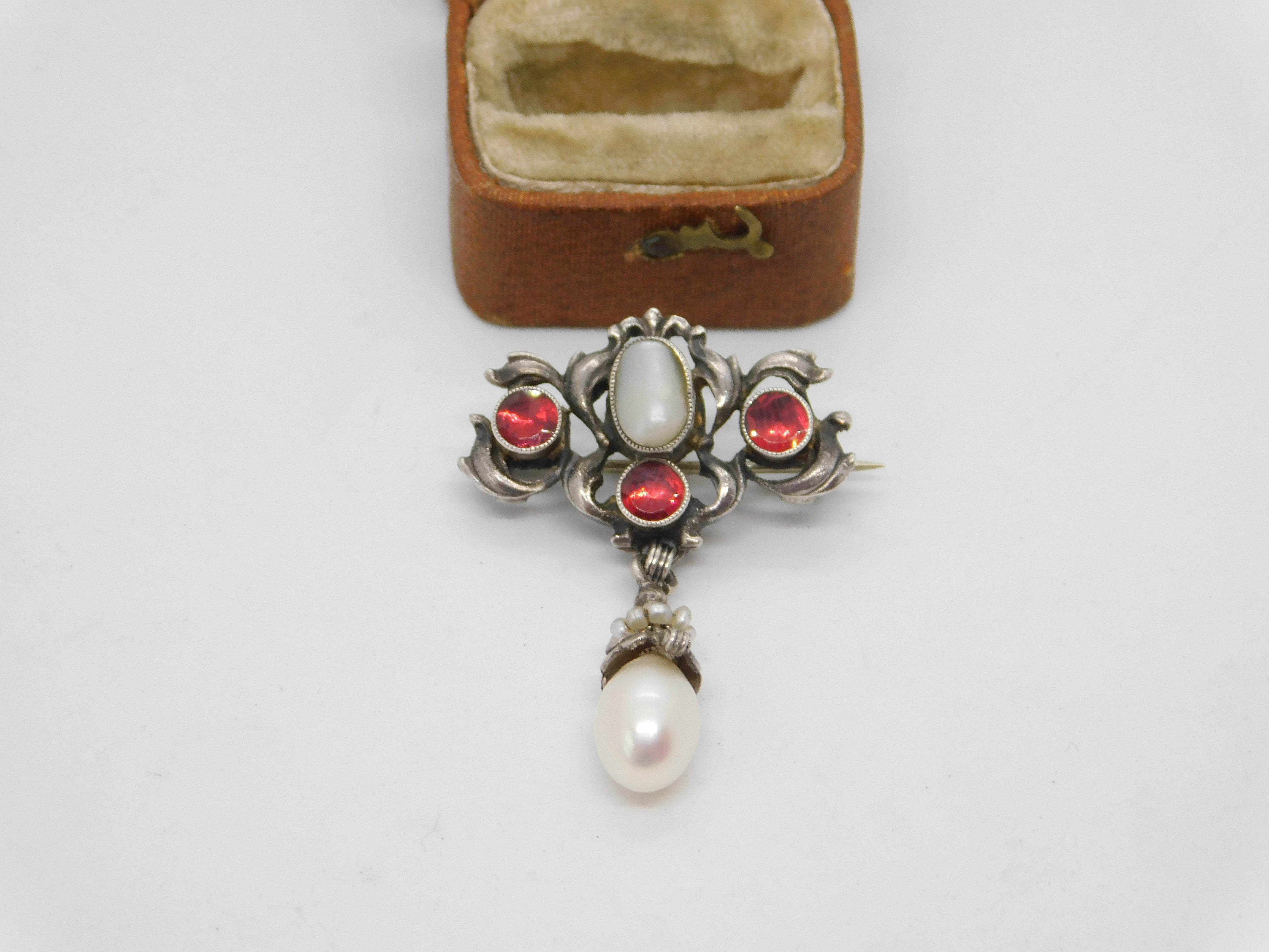Victorian Austrian Sterling Silver, Pearl & Garnet Floral Drop Brooch c1850