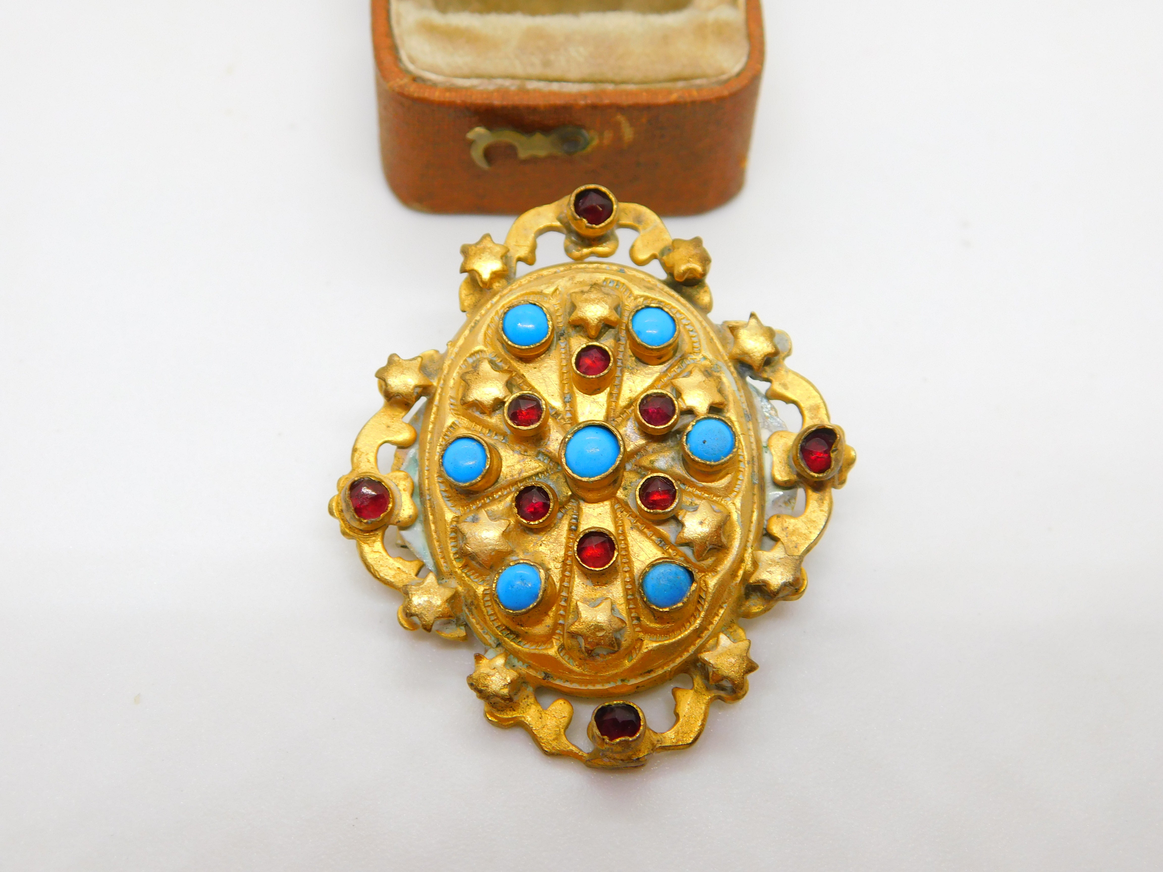 Victorian Austrian Pinchbeck Turquoise & Garnet Star Brooch c1840 Antique