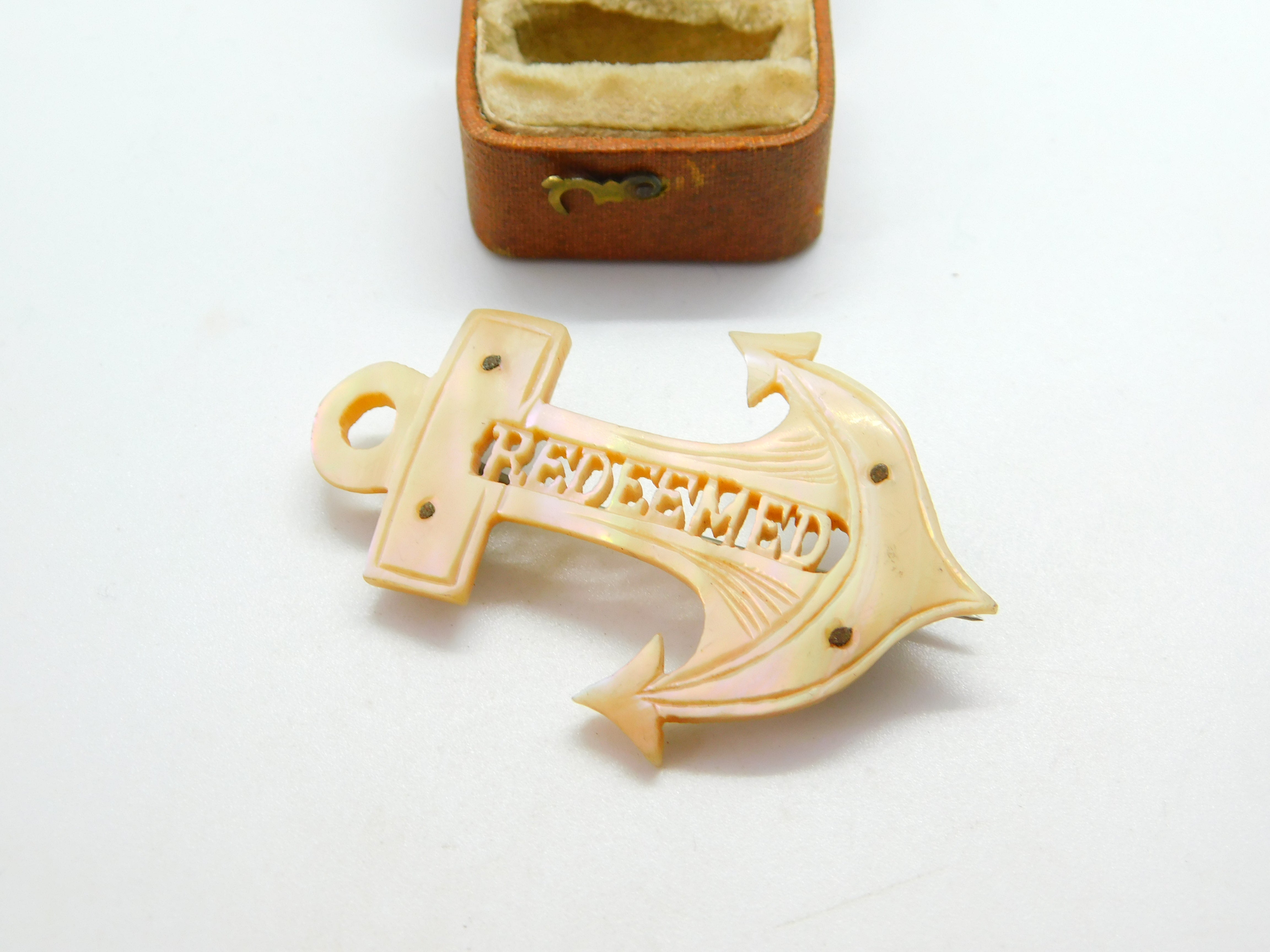 Victorian Carved Mother of Pearl Anchor of Hope 'Redeemed' Brooch c1850 Antique