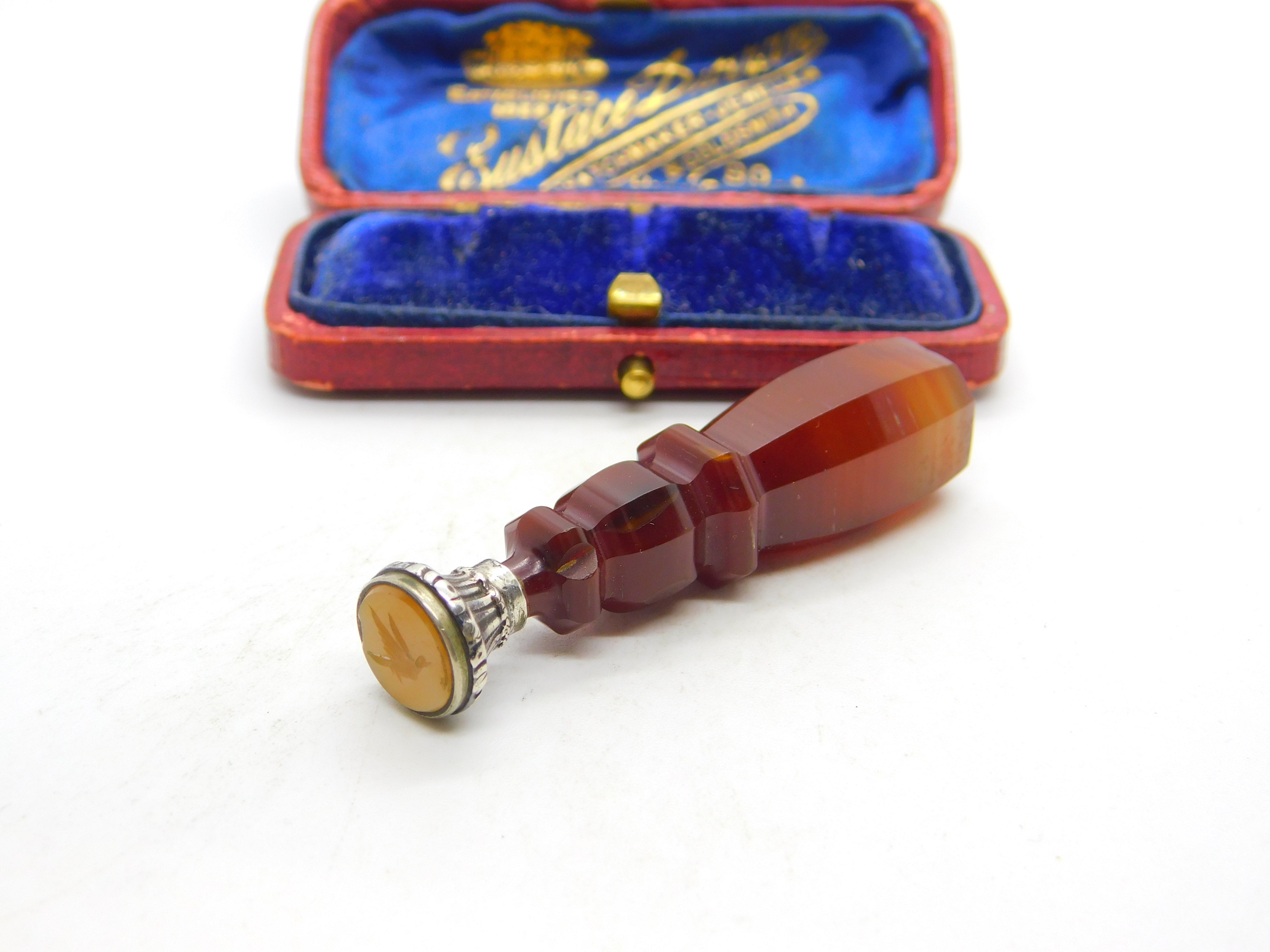 Victorian Carved Red Banded Agate, Sterling Silver Swallow Bird Desk Seal c1880