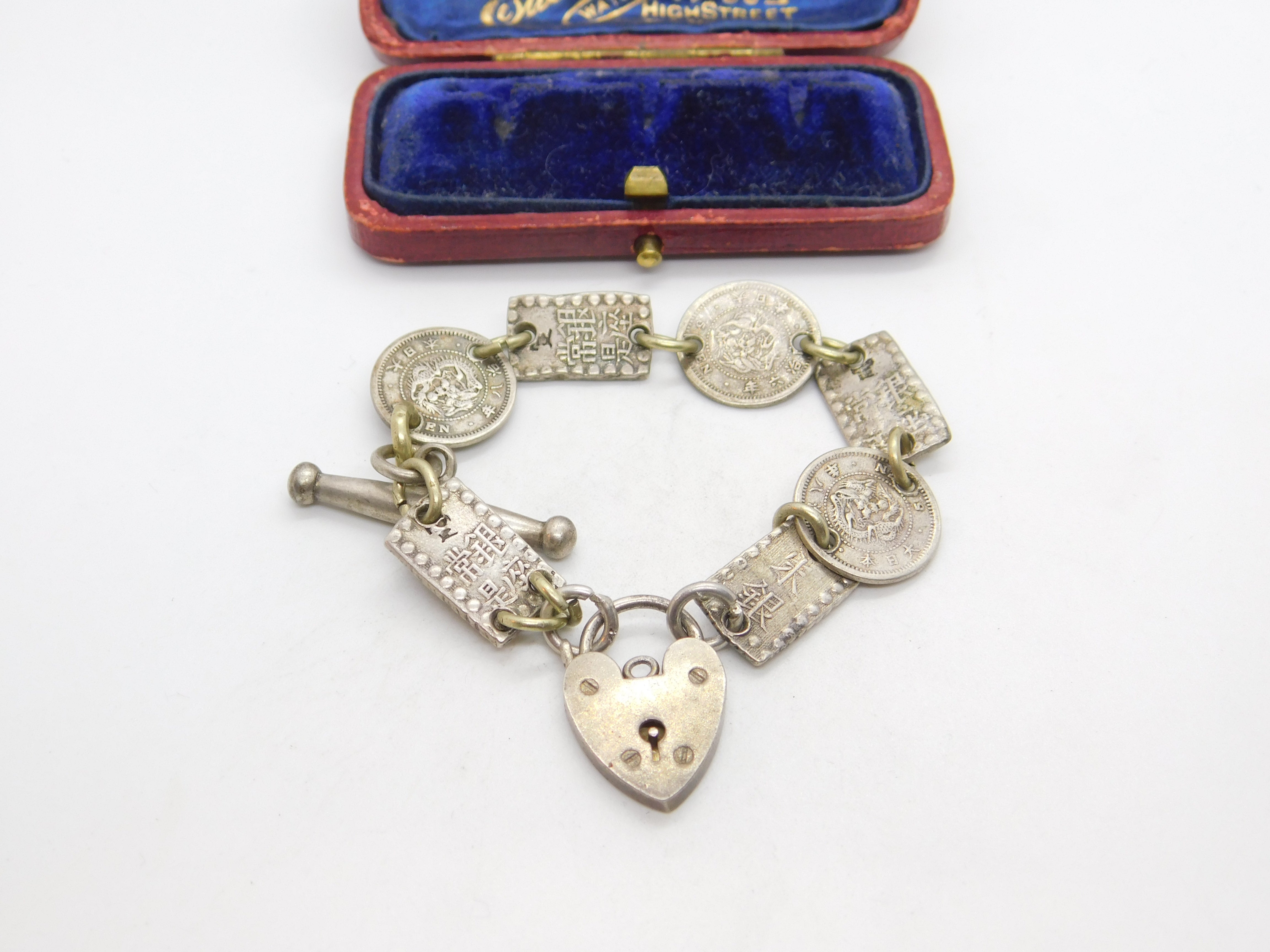 Victorian Chinese Sterling Silver Coin & Token Charm Bracelet Antique c1880