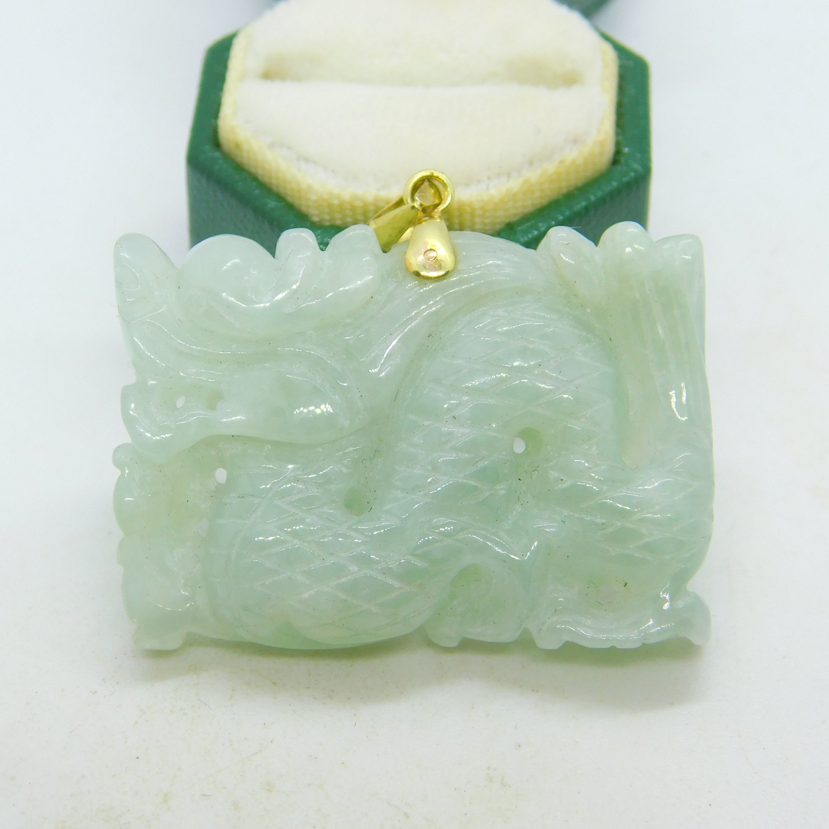 14ct Yellow Gold & Carved Apple-Green Jade Dragon Pendant Vintage c1970