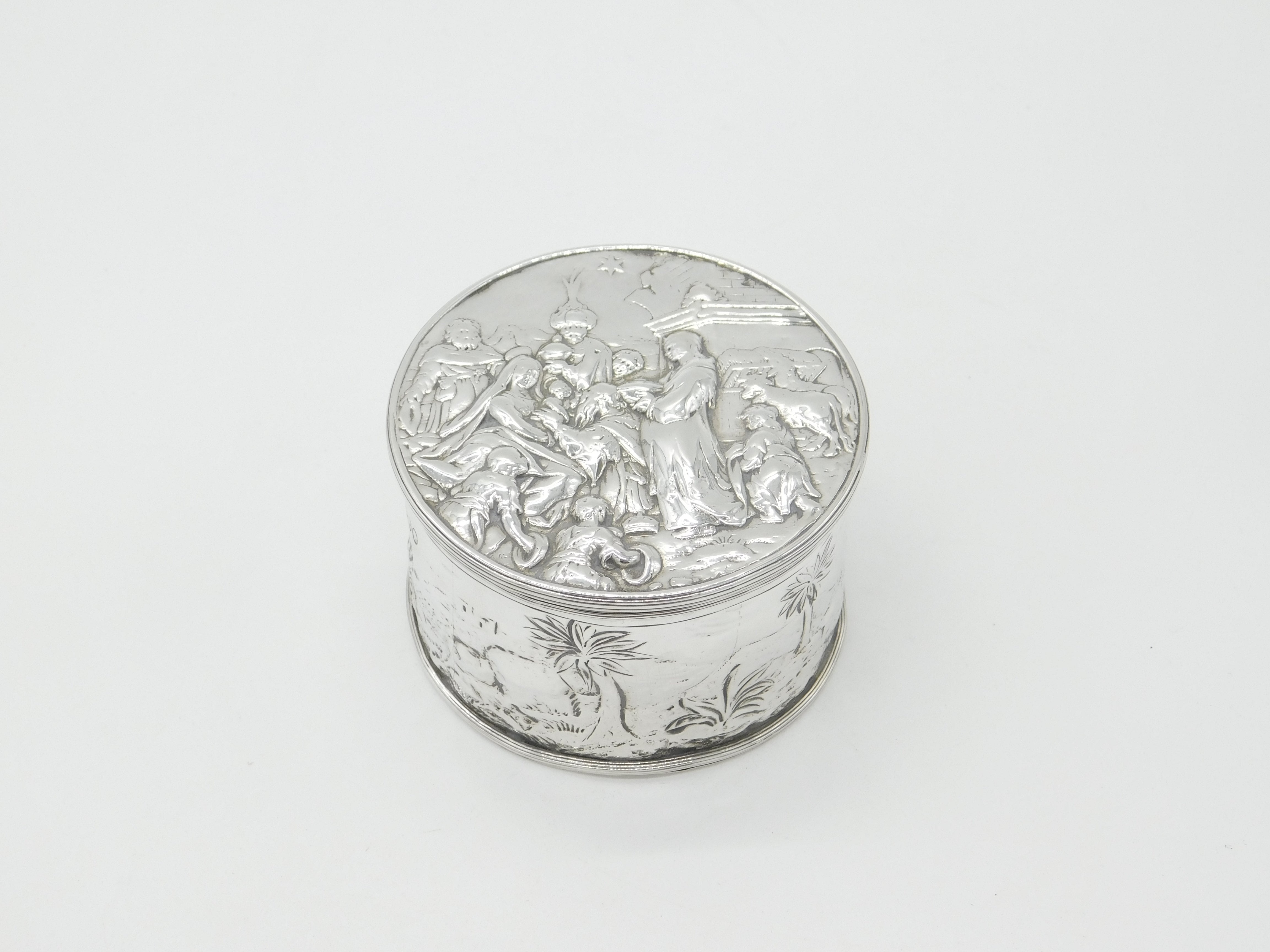 Victorian Large Sterling Silver Trinket Box with Jesus in the Manger Scene 1882
