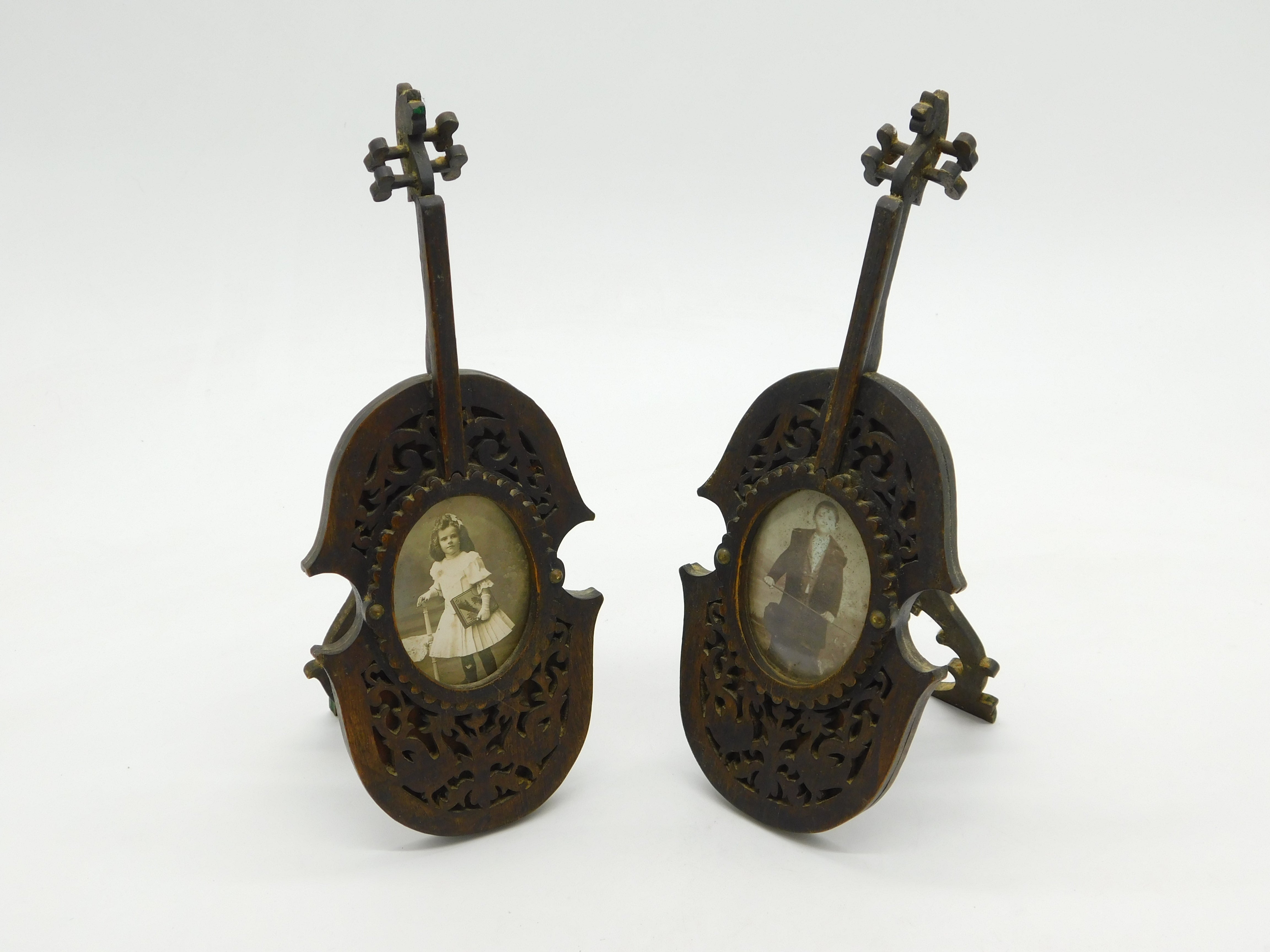 Victorian Pair of Carved Stained Oak Violin Form Picture Frames Antique c1880