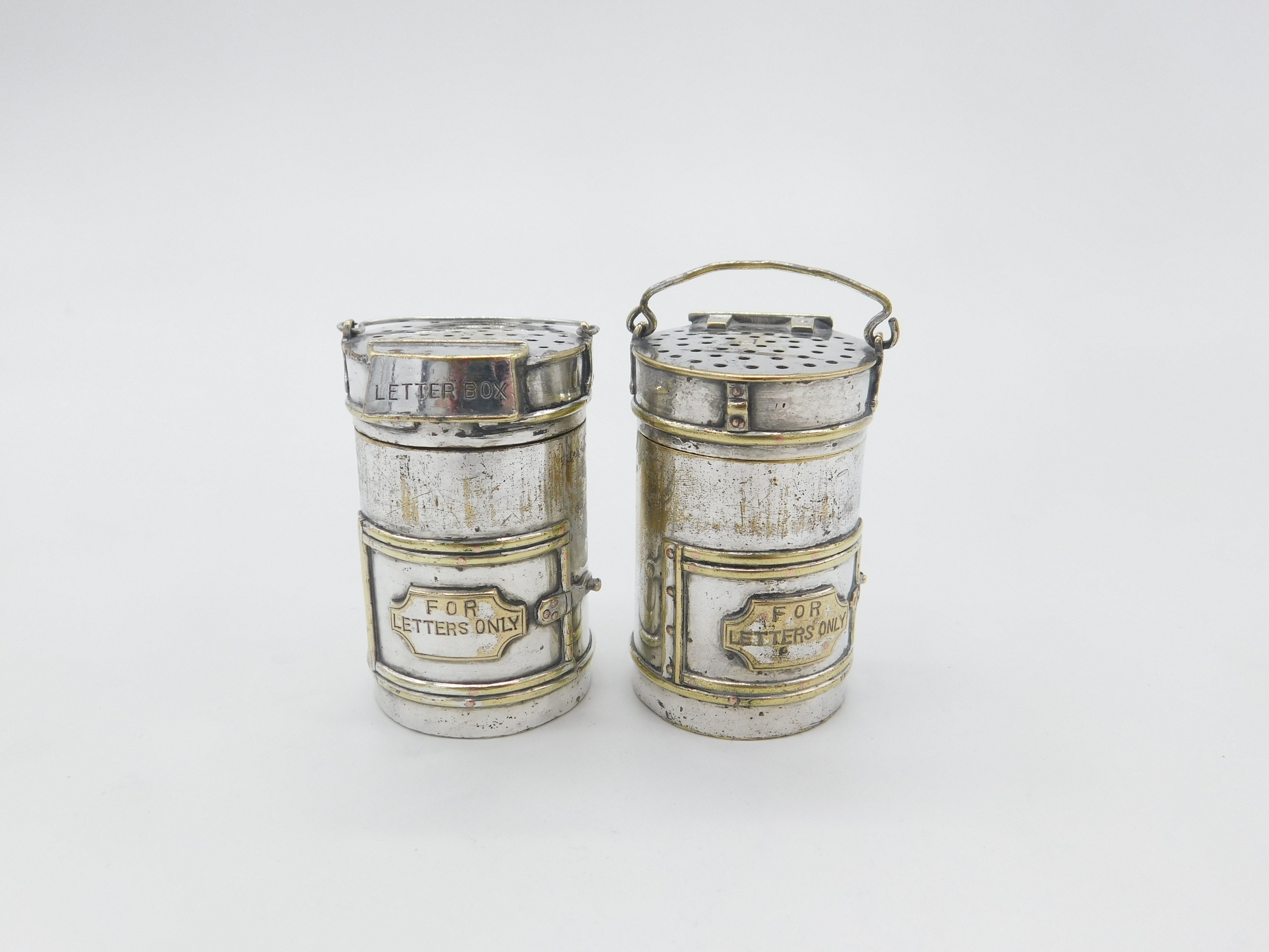 Victorian Pair Novelty Silver Plated Post Box Salt & Pepper Shakers Antique 1880