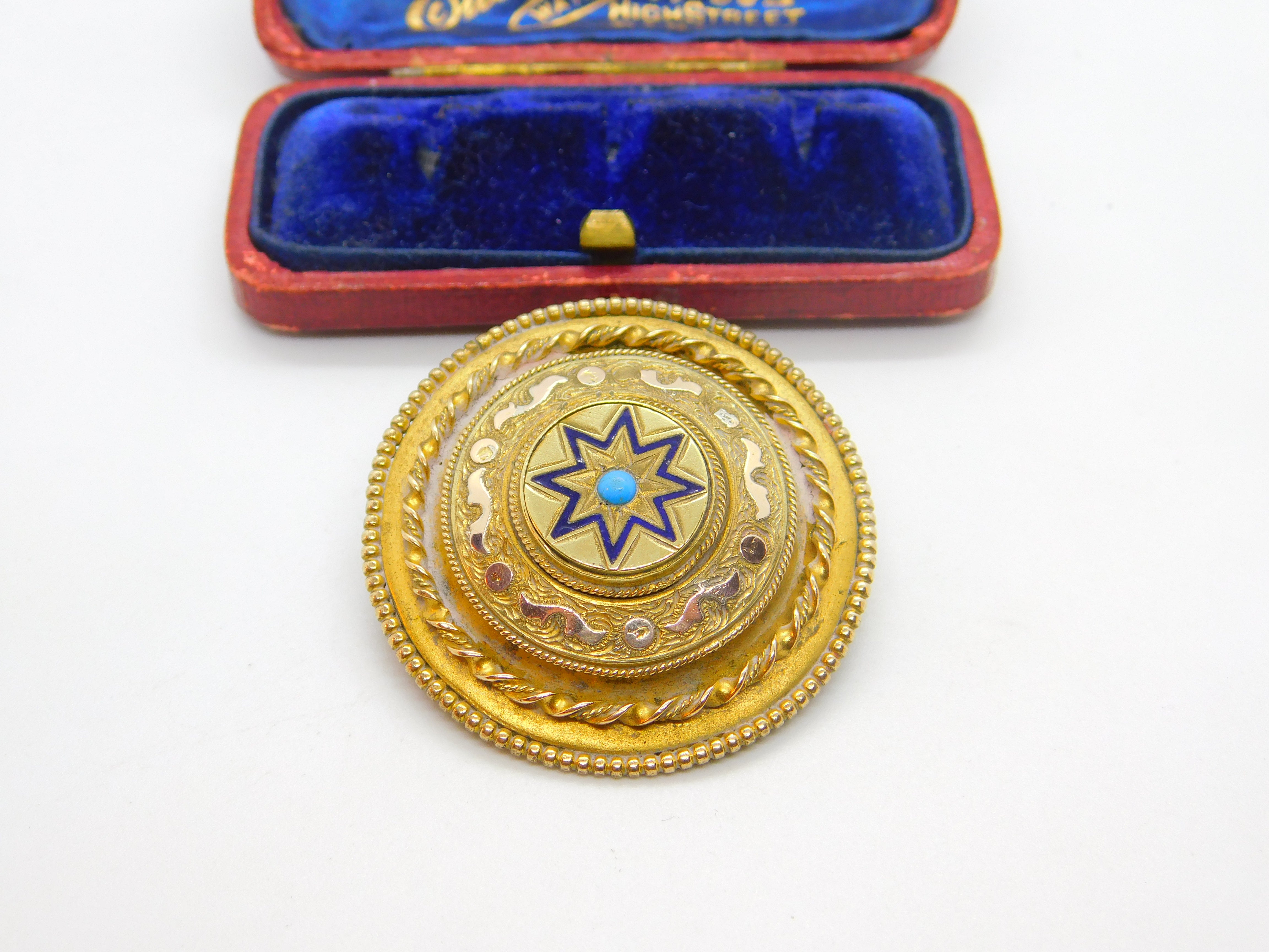 Victorian Pinchbeck Gold, Enamel & Turquoise Sweetheart Brooch c1860 Antique